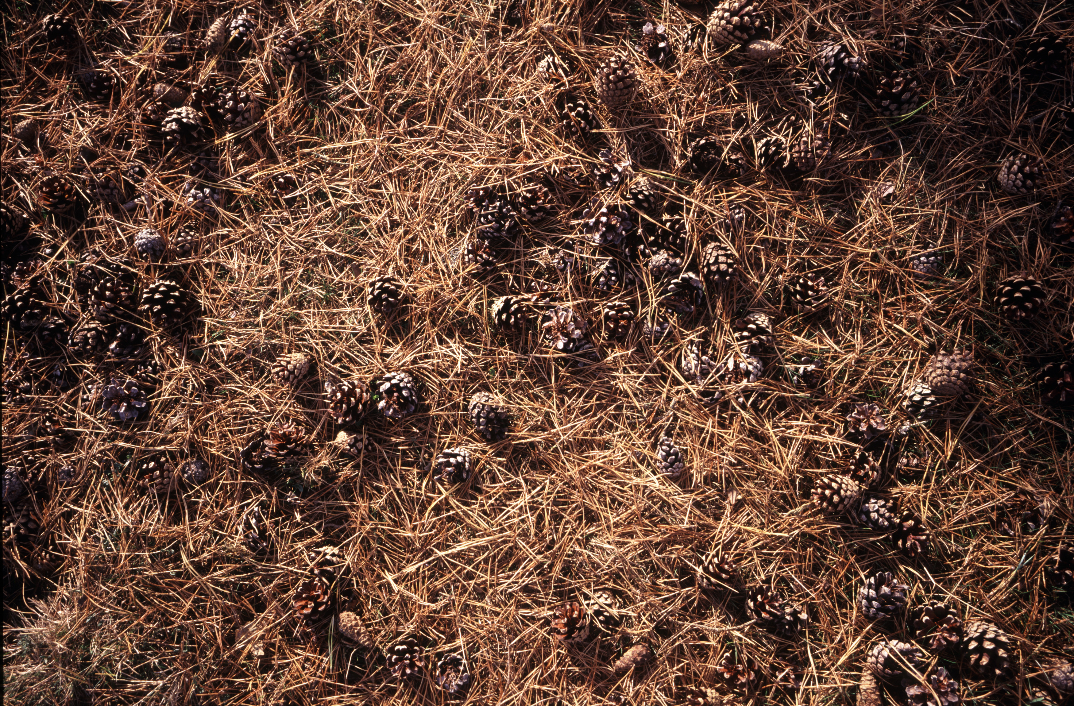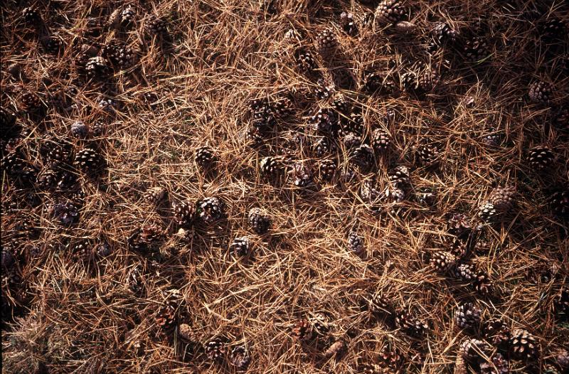 Image Description: Dried pine needles and cones lying on a forest floor in a full frame nature and environmental background