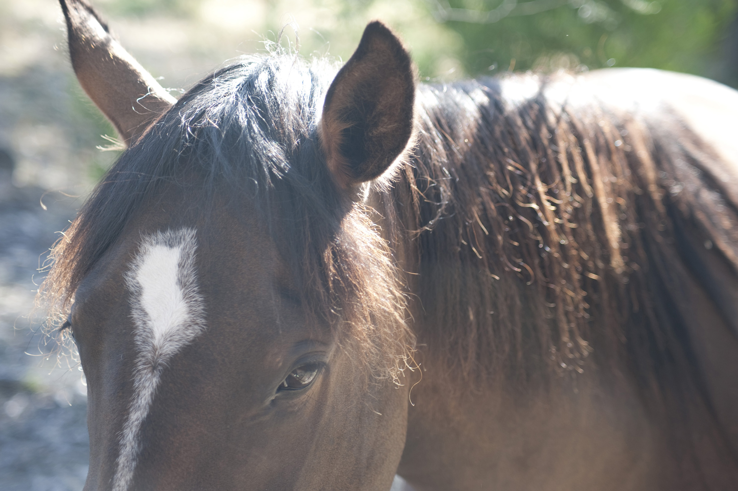 Image Description: Closeup of a horse's head with pricked ears and focus to the eye outdoors in sunlight