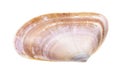 Image Description: Isolated single half of a bivalve clam shell on white showing the ridged fan-shaped pattern