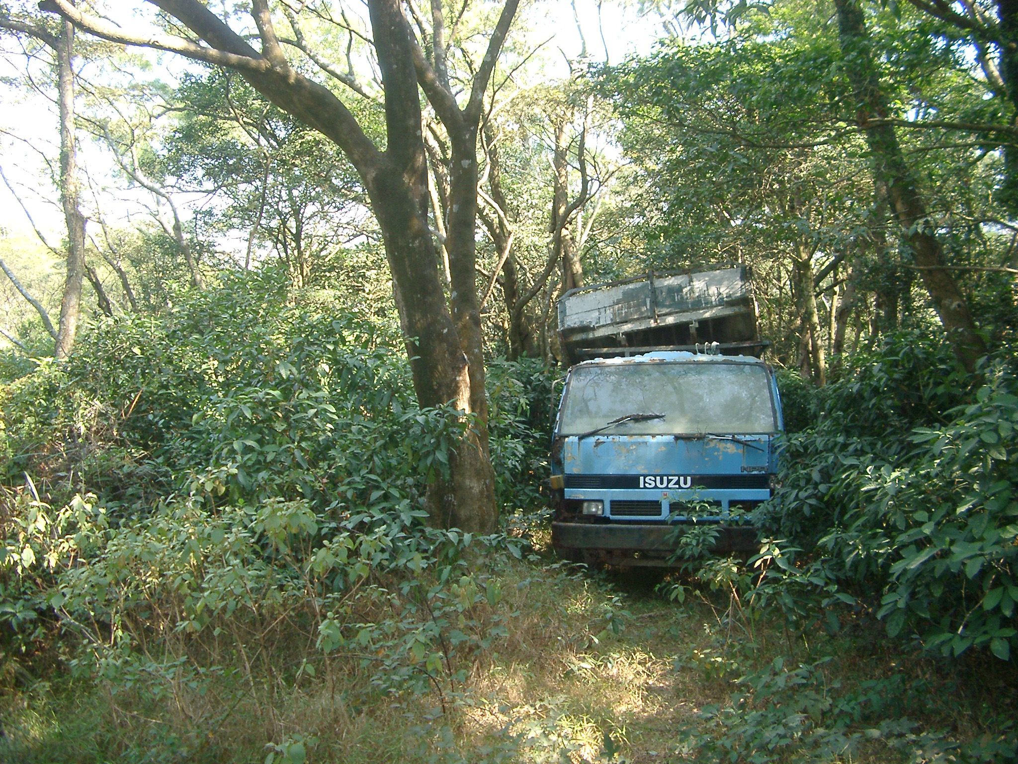 Image Description: Abandoned truck in an overgrown woodland