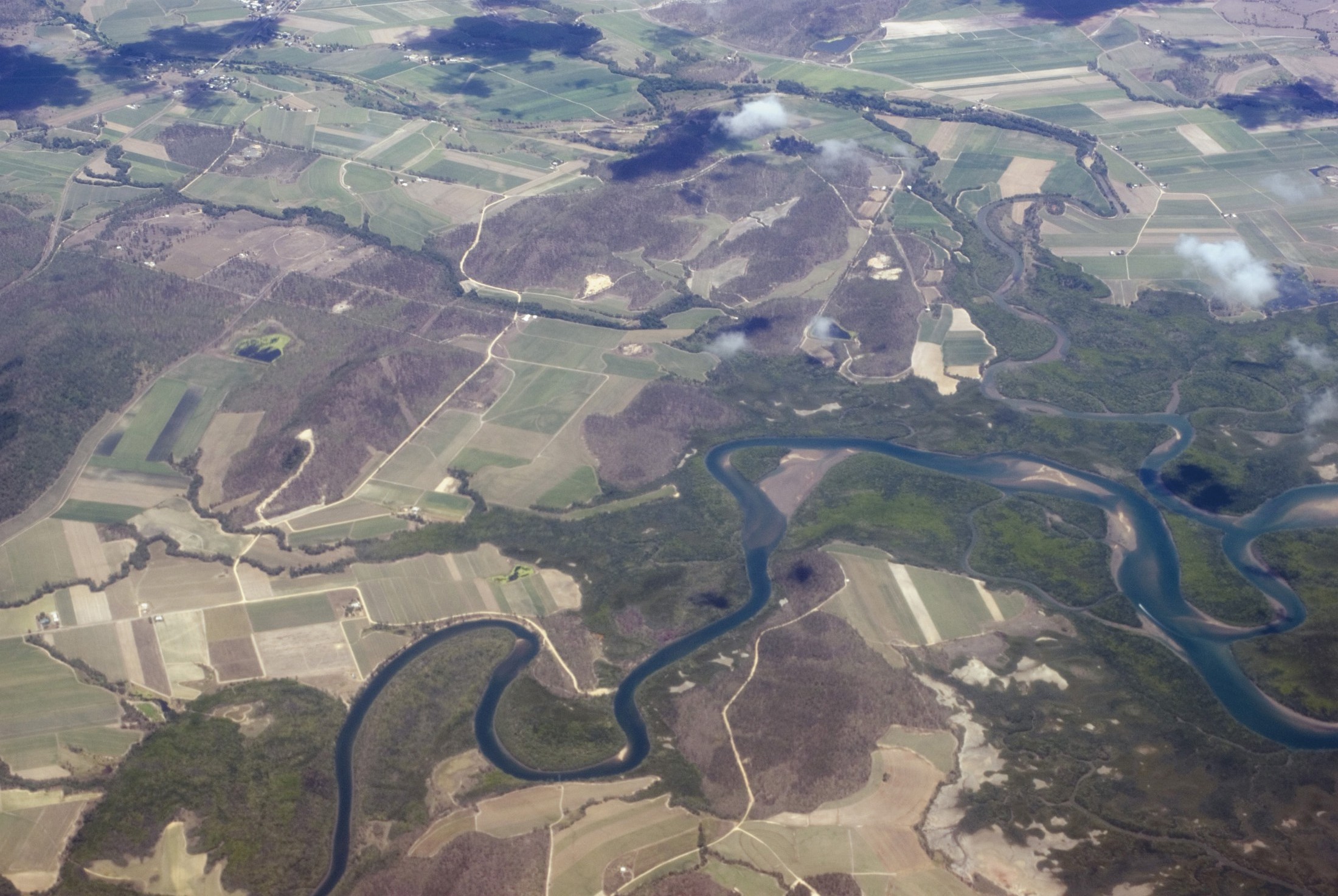 Image Description: Aerial view of a riverine estuary and floodplain winding through fertile agricultural land and fields