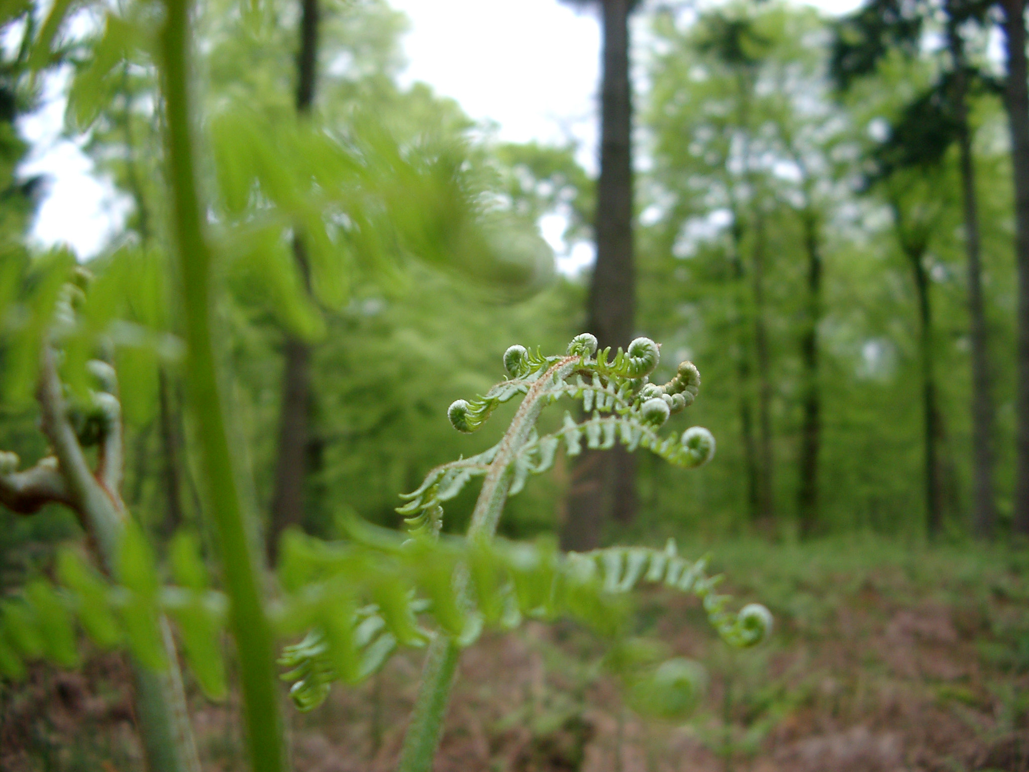Image Description: Detail of the opening fronds of a fern in a woodland setting. Intentional shallow depth of field