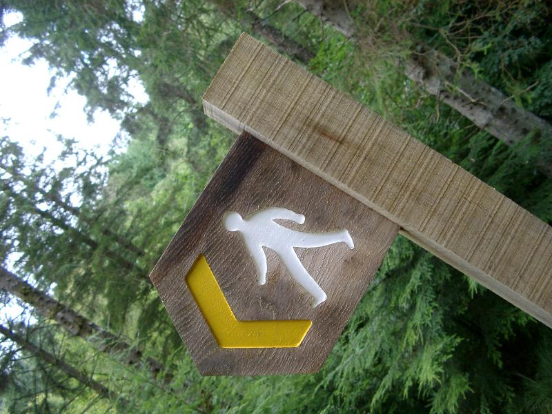 Image Description: Wooden sign marking a footpath showing a cutout of a walking man painted in white with a yellow arrow alongside in a woodland setting