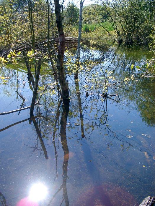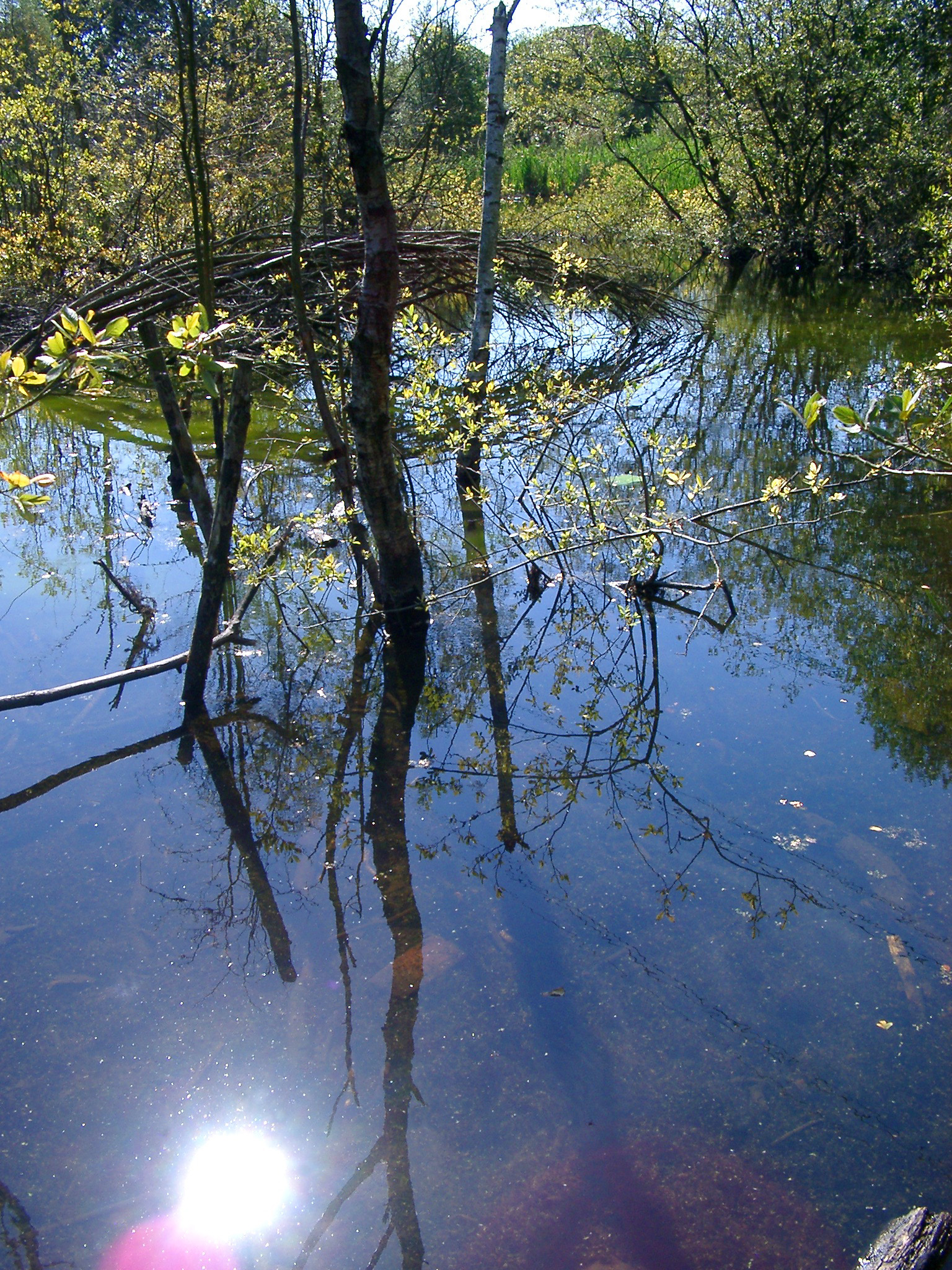 Image Description: Reflections of tree trunks and vegetation in a tranquil pond with the reflected orb of the sun causing natural sun flare
