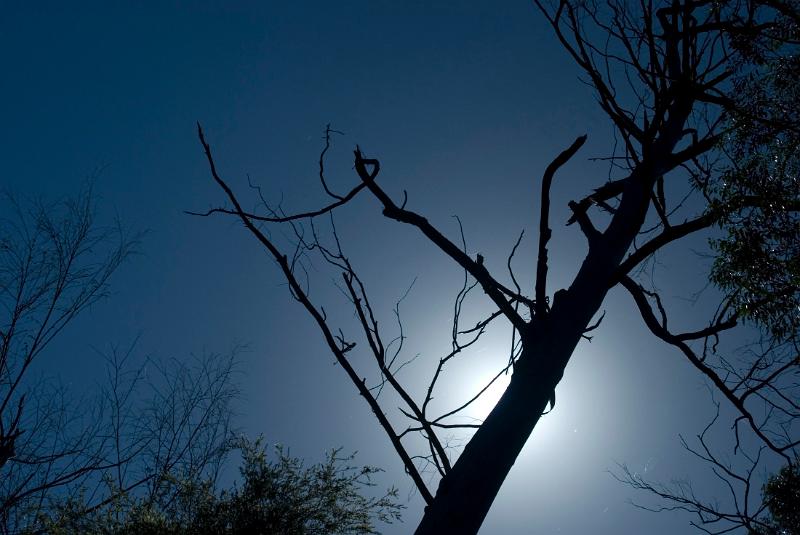 Image Description: Stark branches of a tree are silhouetted against the glare from a scorching sun