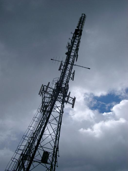 Image Description: Vert tall steel lattice communications tower stretching up towards the cloudy blue sky with antennas and radio dishes mounted up its length