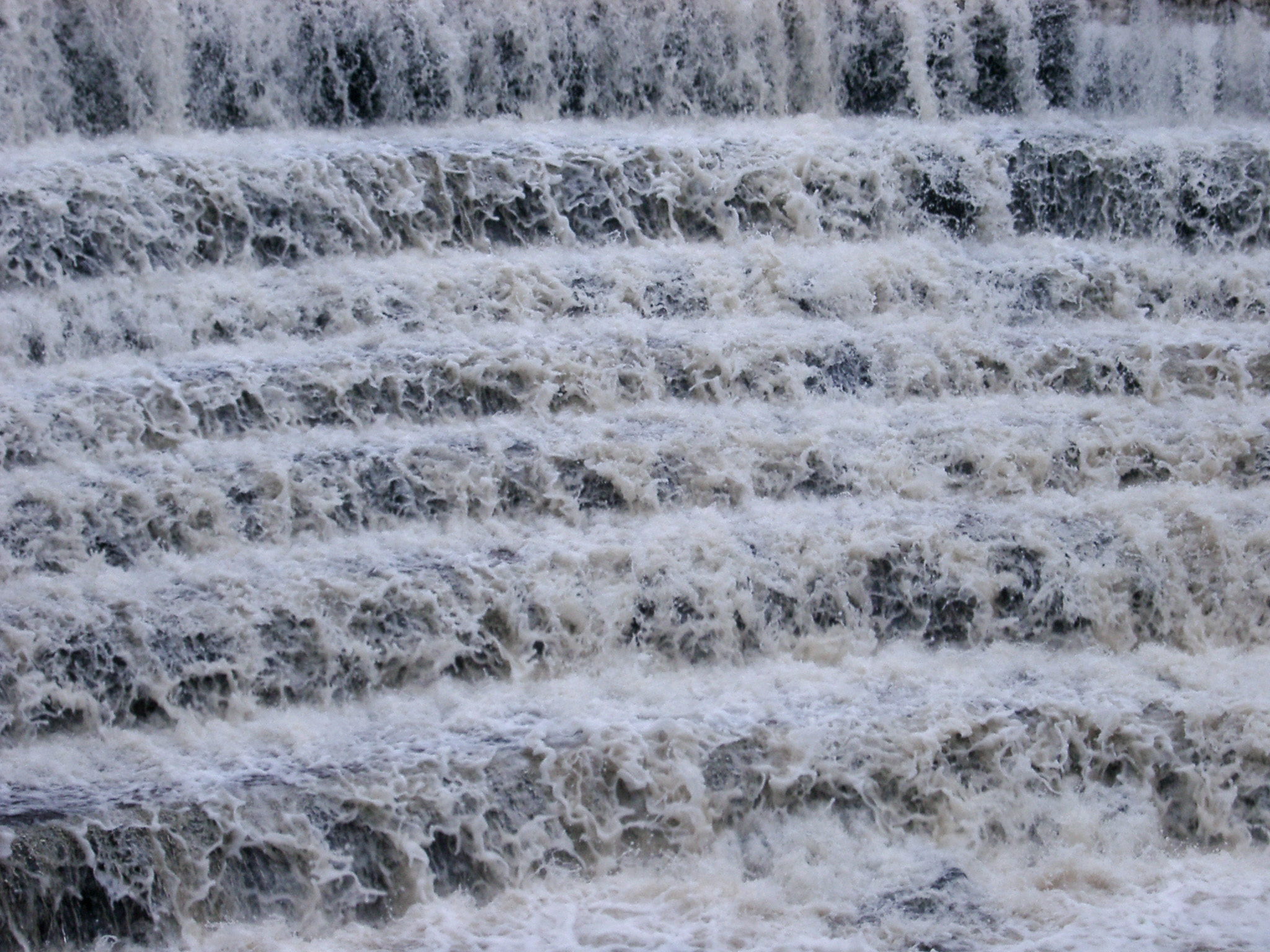 Image Description: White frothy water flowing over a stepped spillway to control flow and direction of an important natural resource