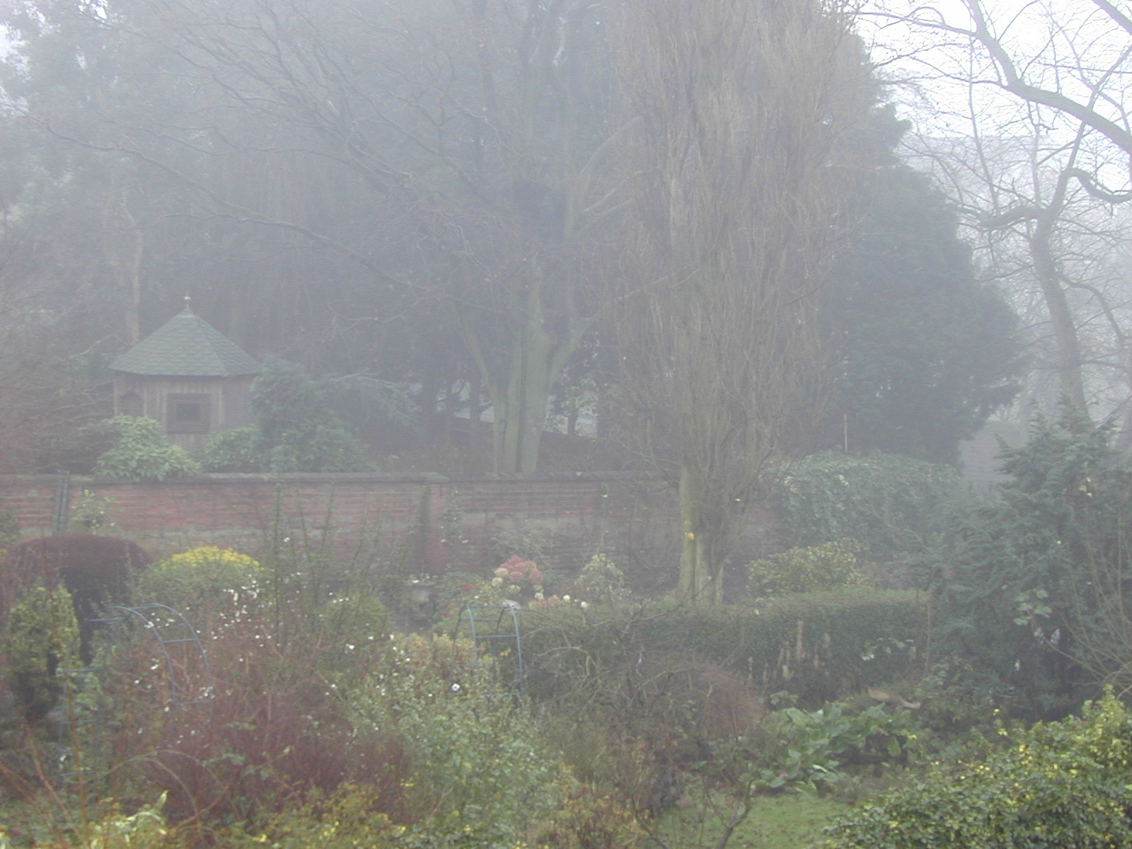 Image Description: Scenic View of Tranquil Garden, Small Hut and Brick Wall Shrouded in Mist