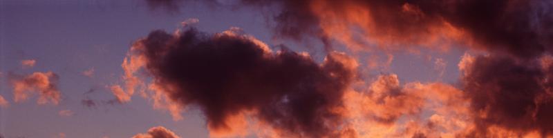 Image Description: Sunset panorama with colorful salmon pink clouds in a twilight sky, horizontal banner and background