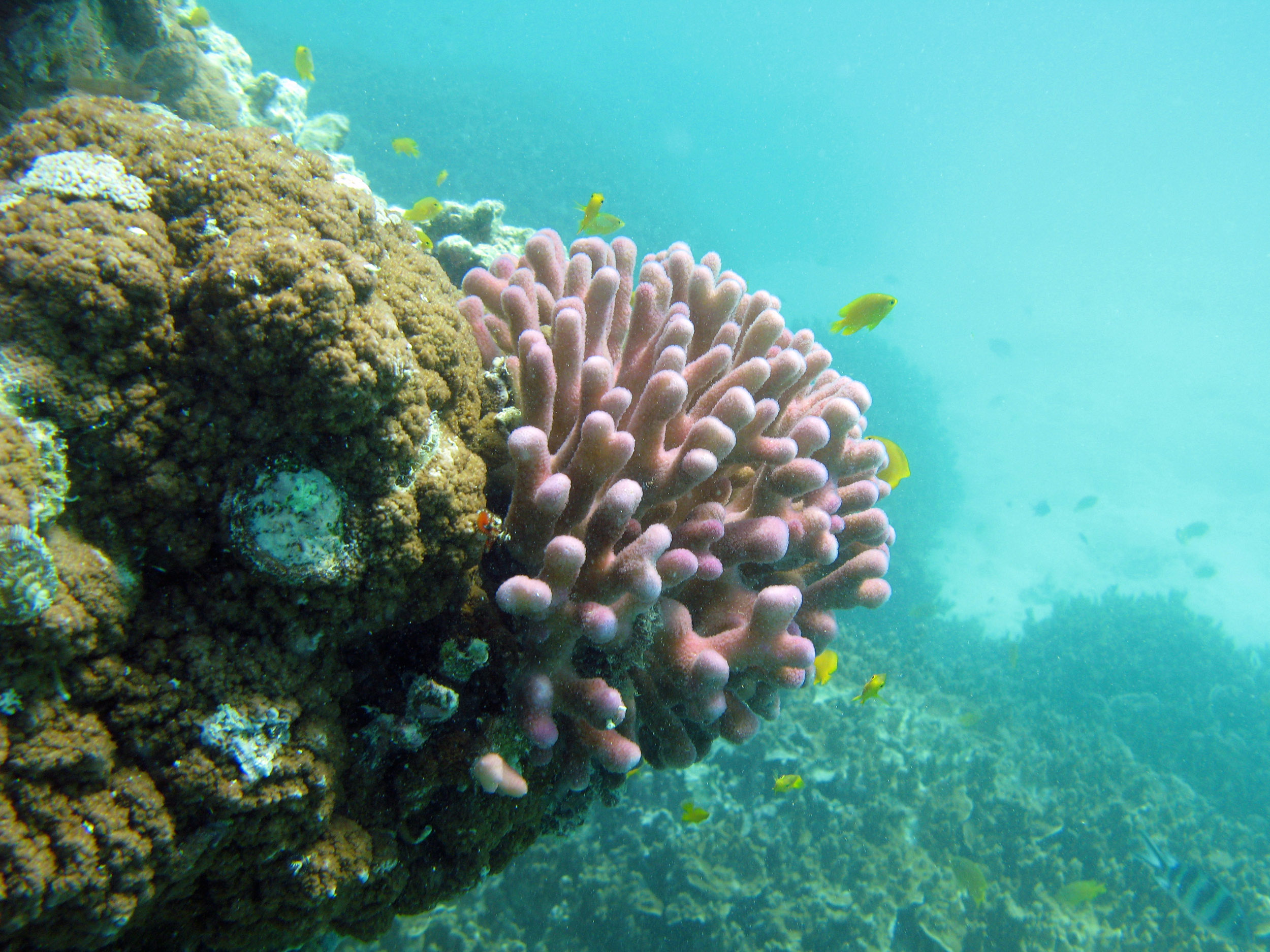 Image Description: Pink finger coral and cabbage corals growing on australias Great Barrier Reef