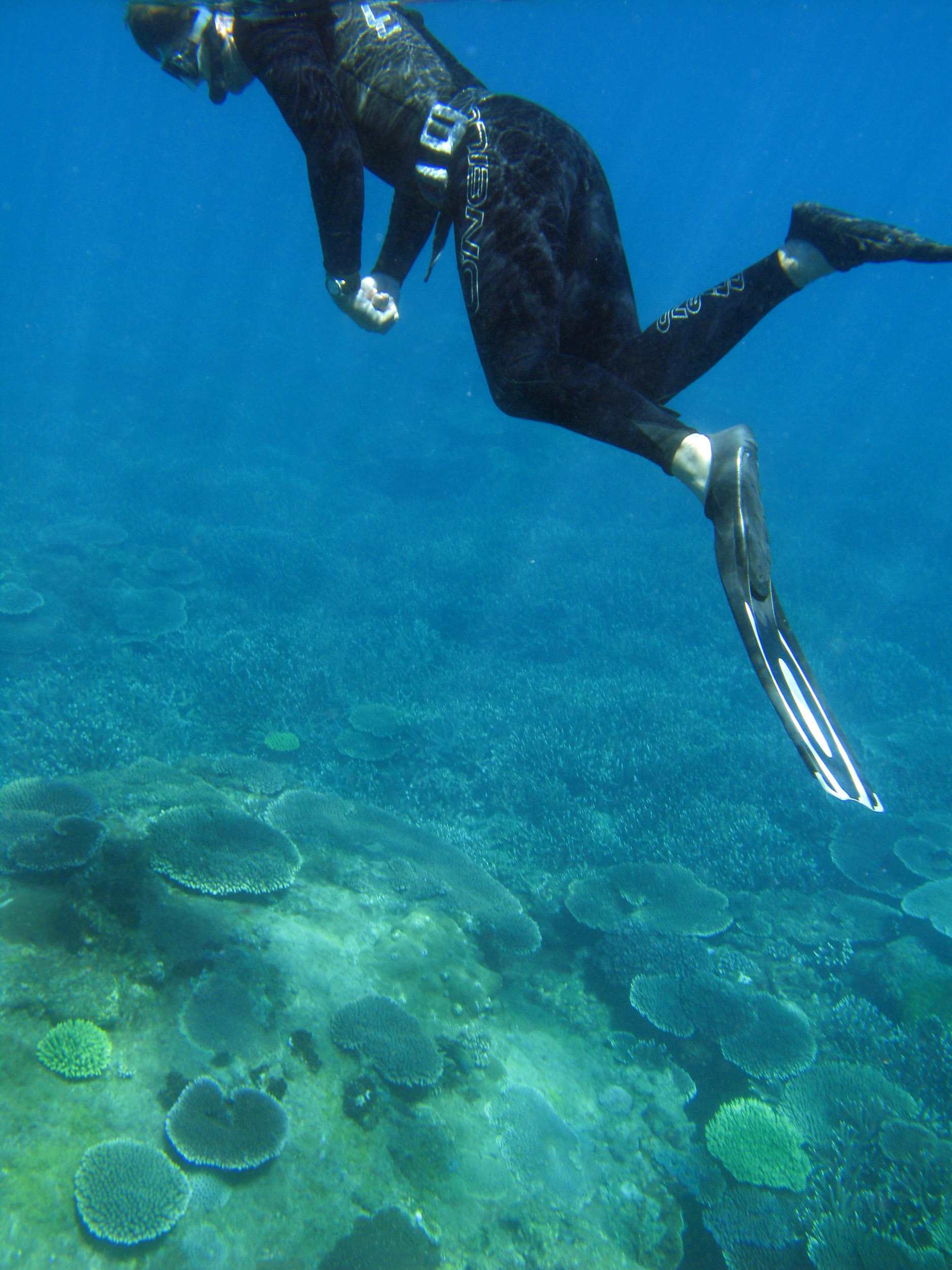 Image Description: A snorkeler swimming over a colourful oceanscape of plate corals