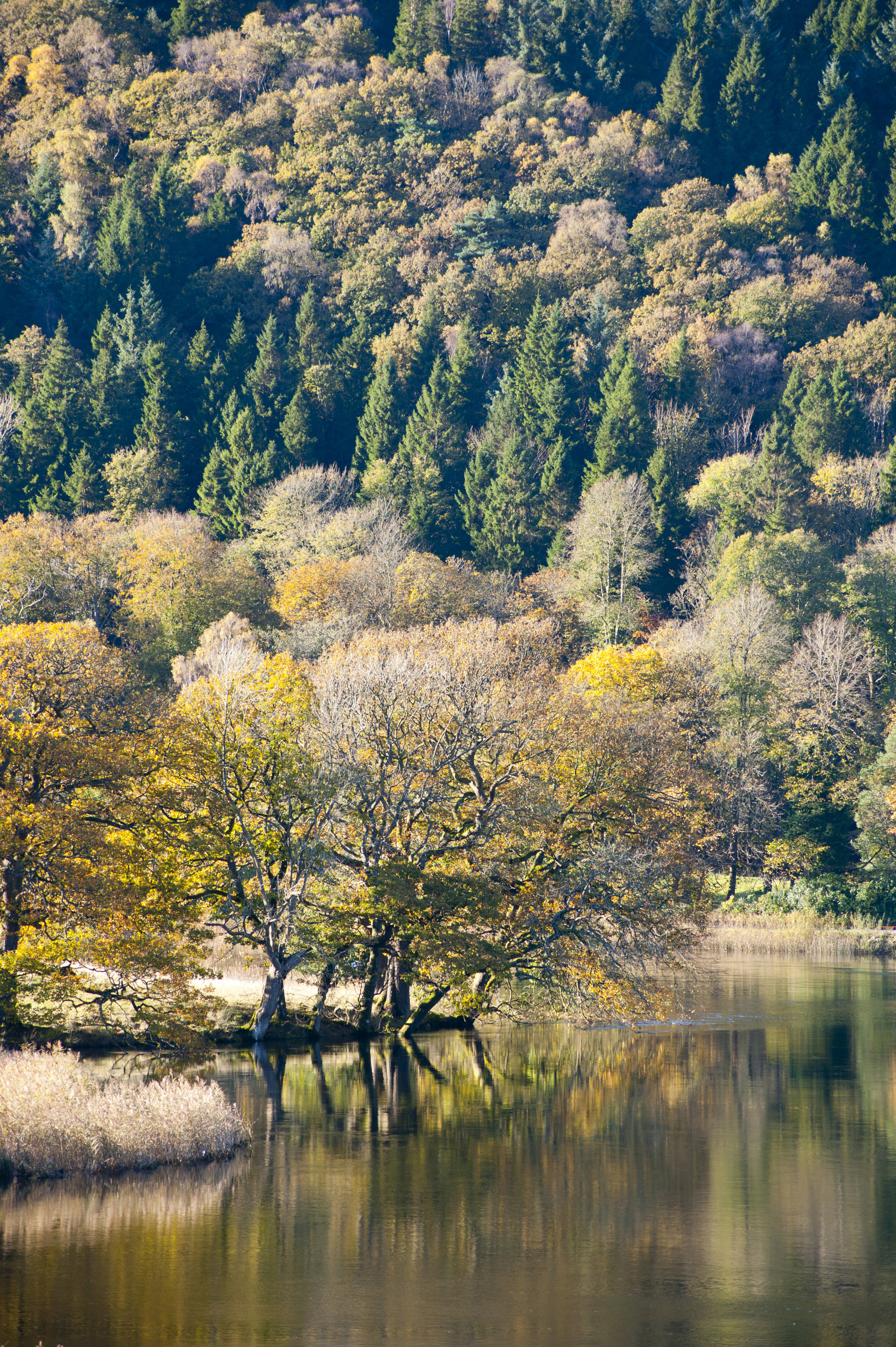 Image Description: Autumn landscape of a tranquil mountain lake surrounded by trees in colorful yellow autumn foliage reflected in the water backed by evergreen pine plantations