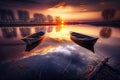 By Downloading/Using this image "Orange sunset over a calm lake with boats" you agree to the terms of use