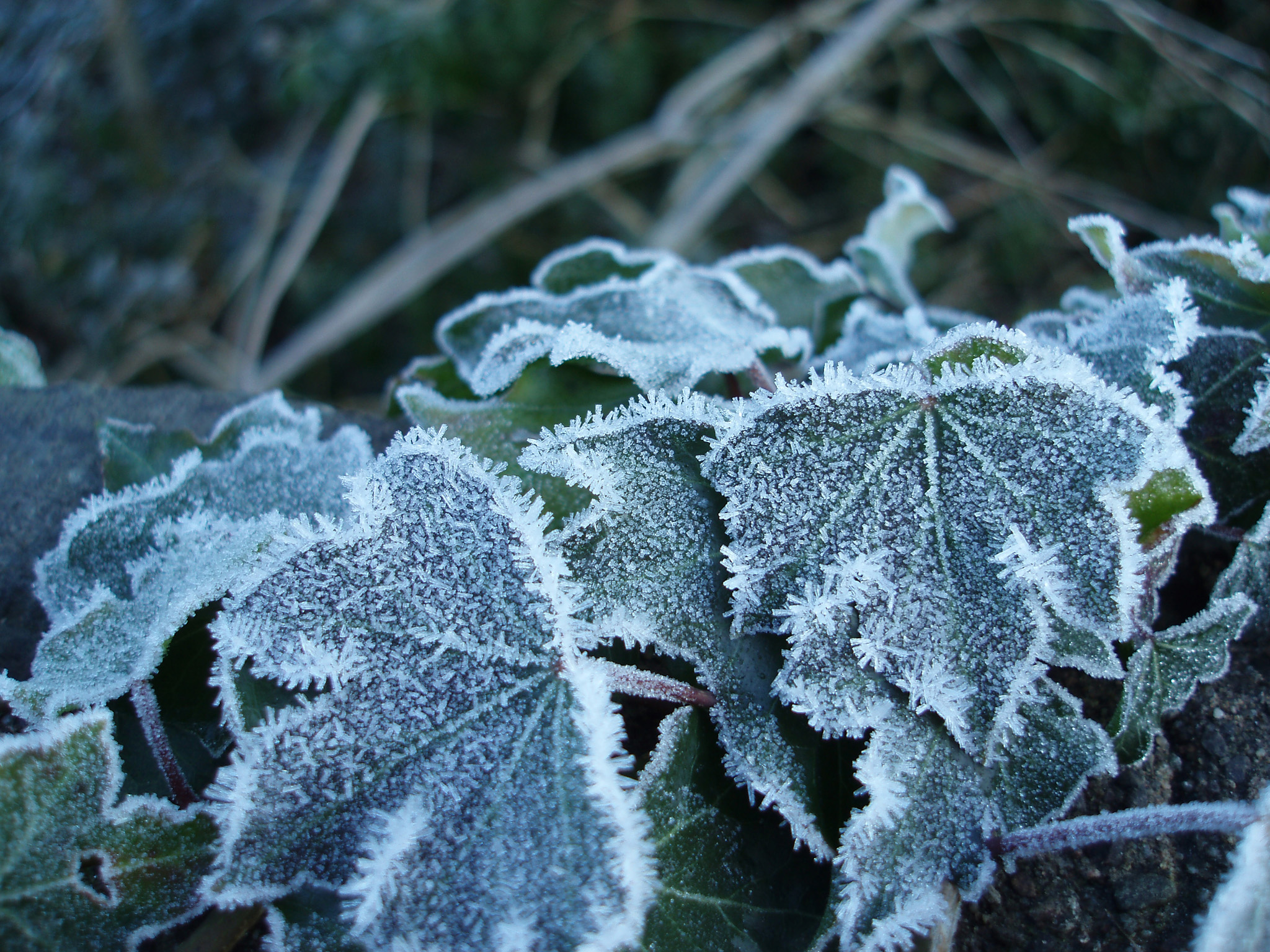 Image Description: ice crystals growing on ivy leaves in an english hedge row