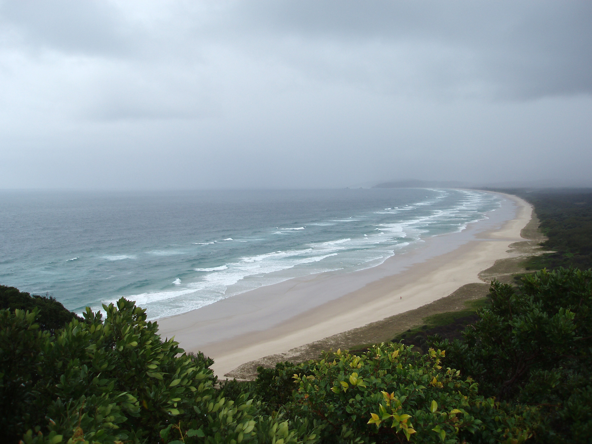 Image Description: rain clouds and waves blown onto the coast and a sandy beach