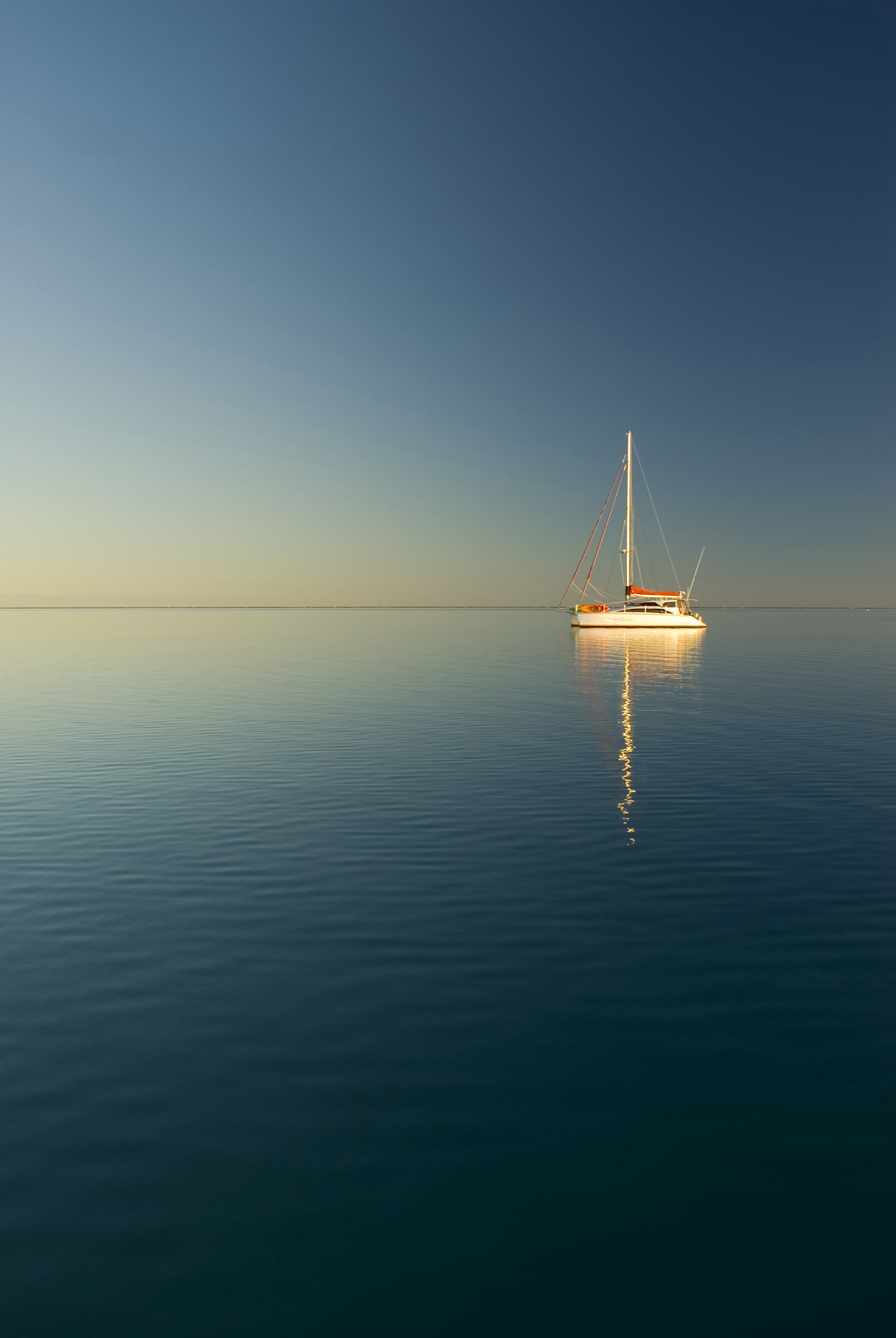 Image Description: lookout out across still water, a lone yacht moored in a sunset glow