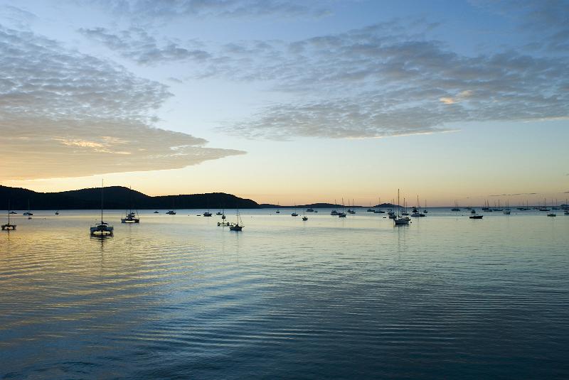 Image Description: serenity of a still sunset over the water, yachts moored as the sun dissappears below the horizon