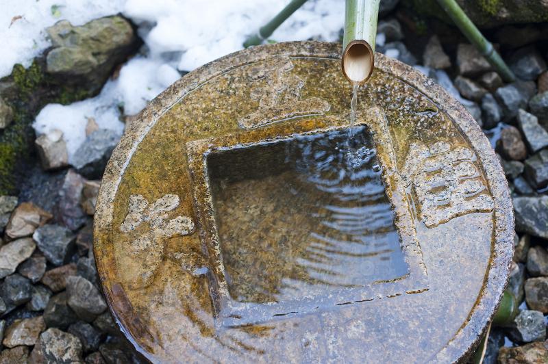 Image Description: Buddhist temple visitors traditionally purify themselves by the ritual washing of hands and mouth, water is running from a tube called a kakei