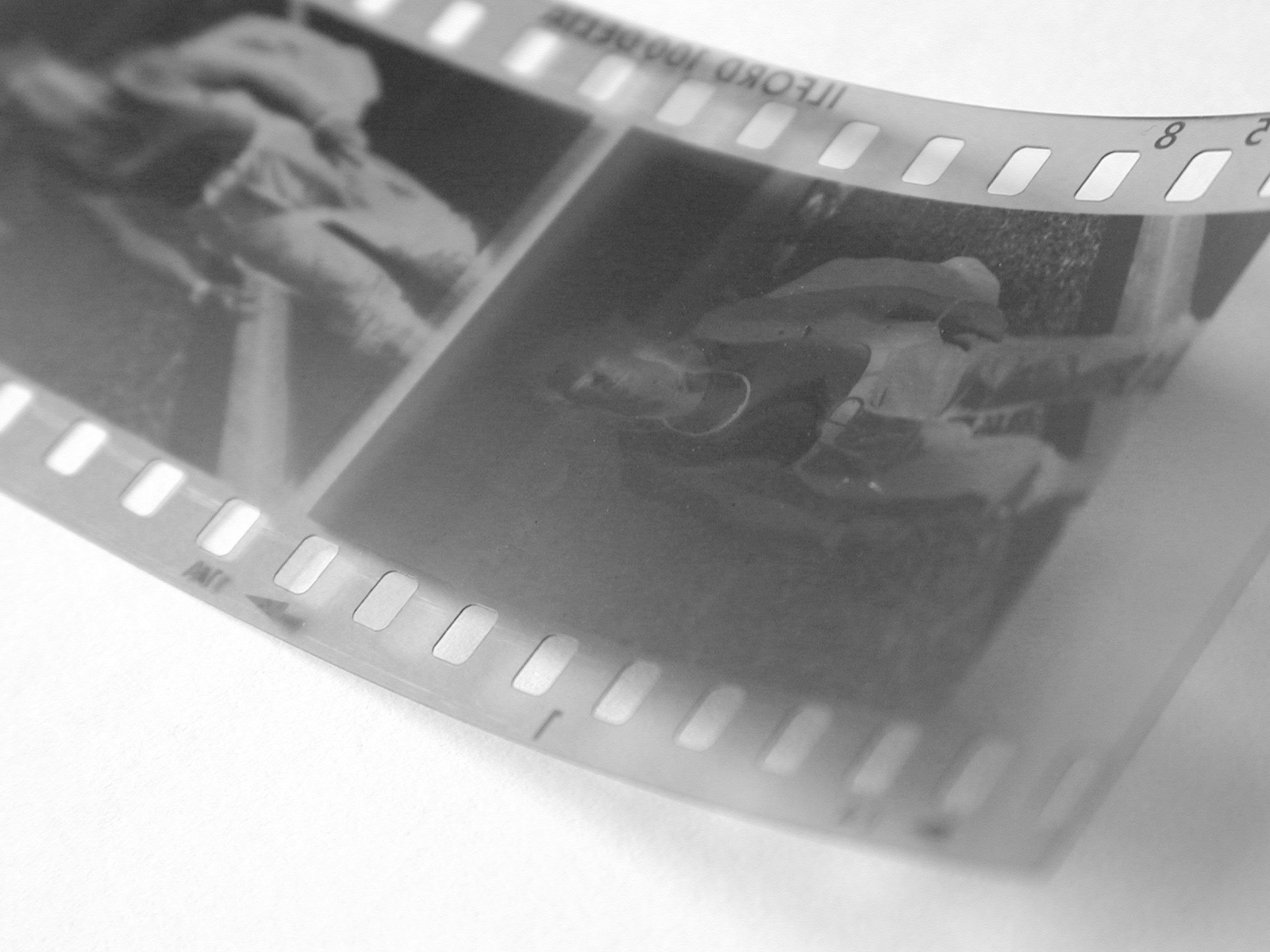 Image Description: Close up of an exposed 35mm negative film strip with frames of a person and sprocket detail in a photography concept