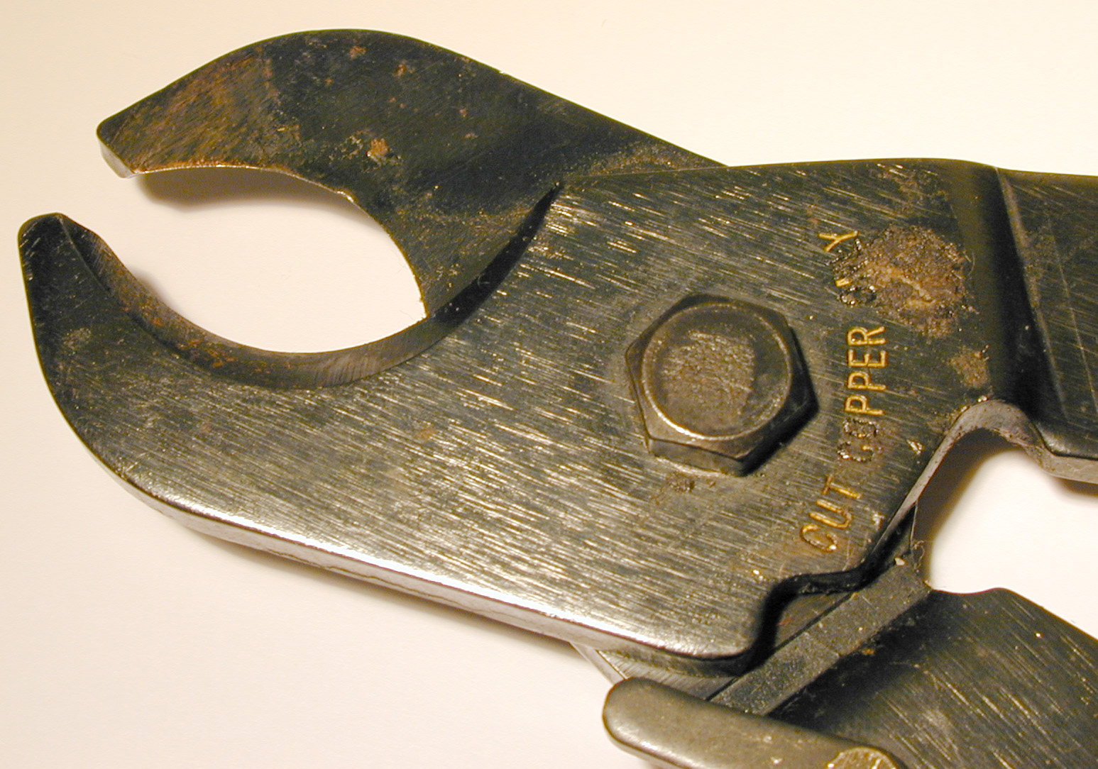 Image Description: Old cutters for copper wires with engraved notice - cut copper only. Viewed in close-up on white surface