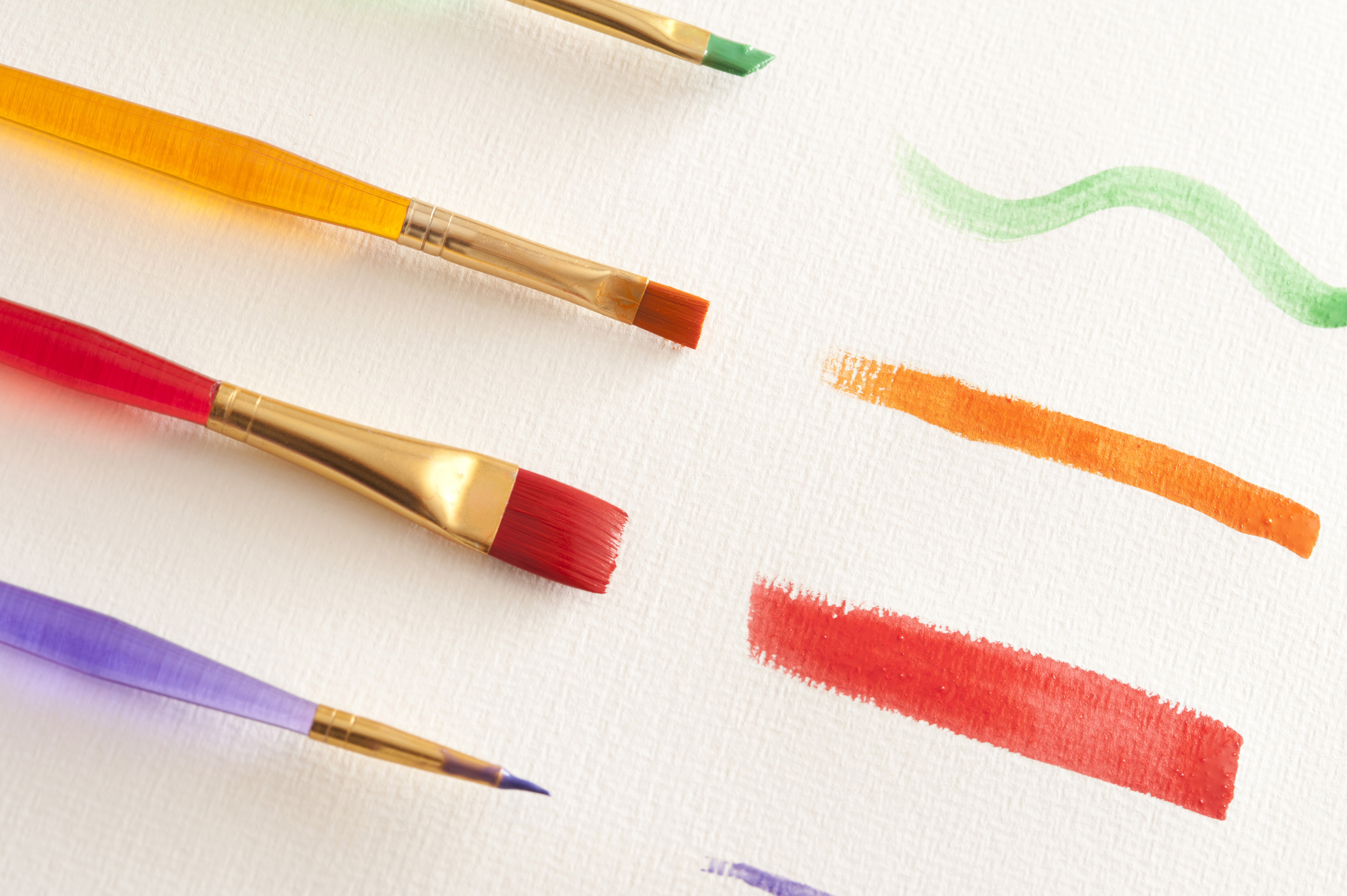 Image Description: Green, orange, red and purple watercolor paint strokes from different sized brushes over white textured canvas paper
