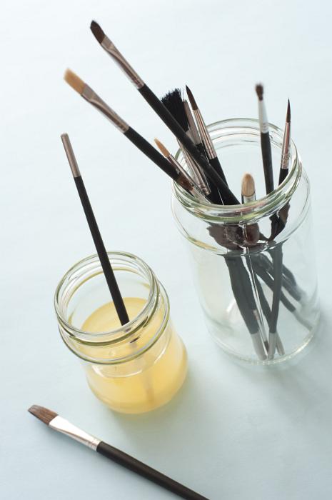 Image Description: Top down view of various sized artist paintbrushes in jars and thinner solution over white table