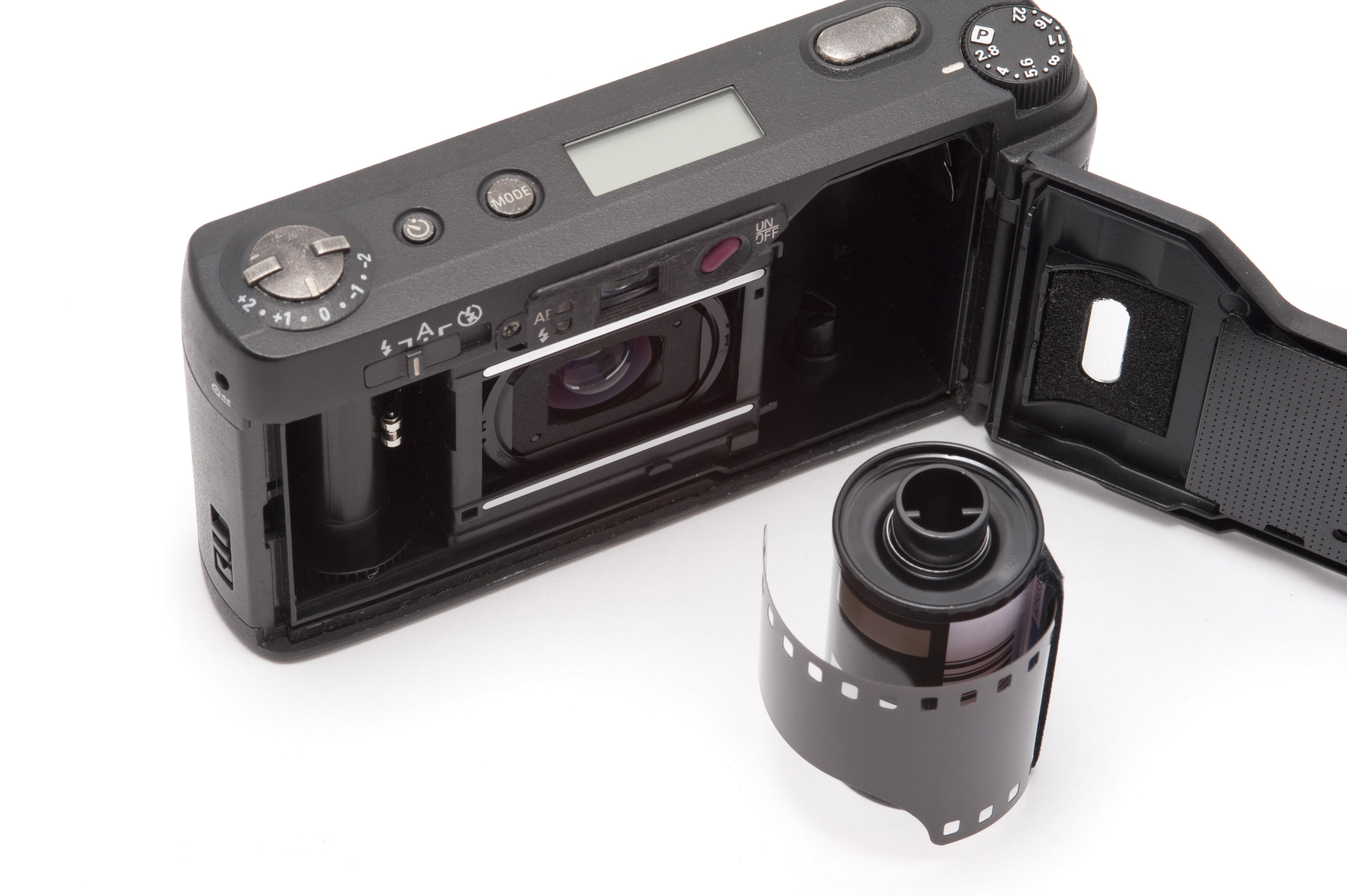 Image Description: Single pocket camera with open back casing next to new roll of 35mm film over white background