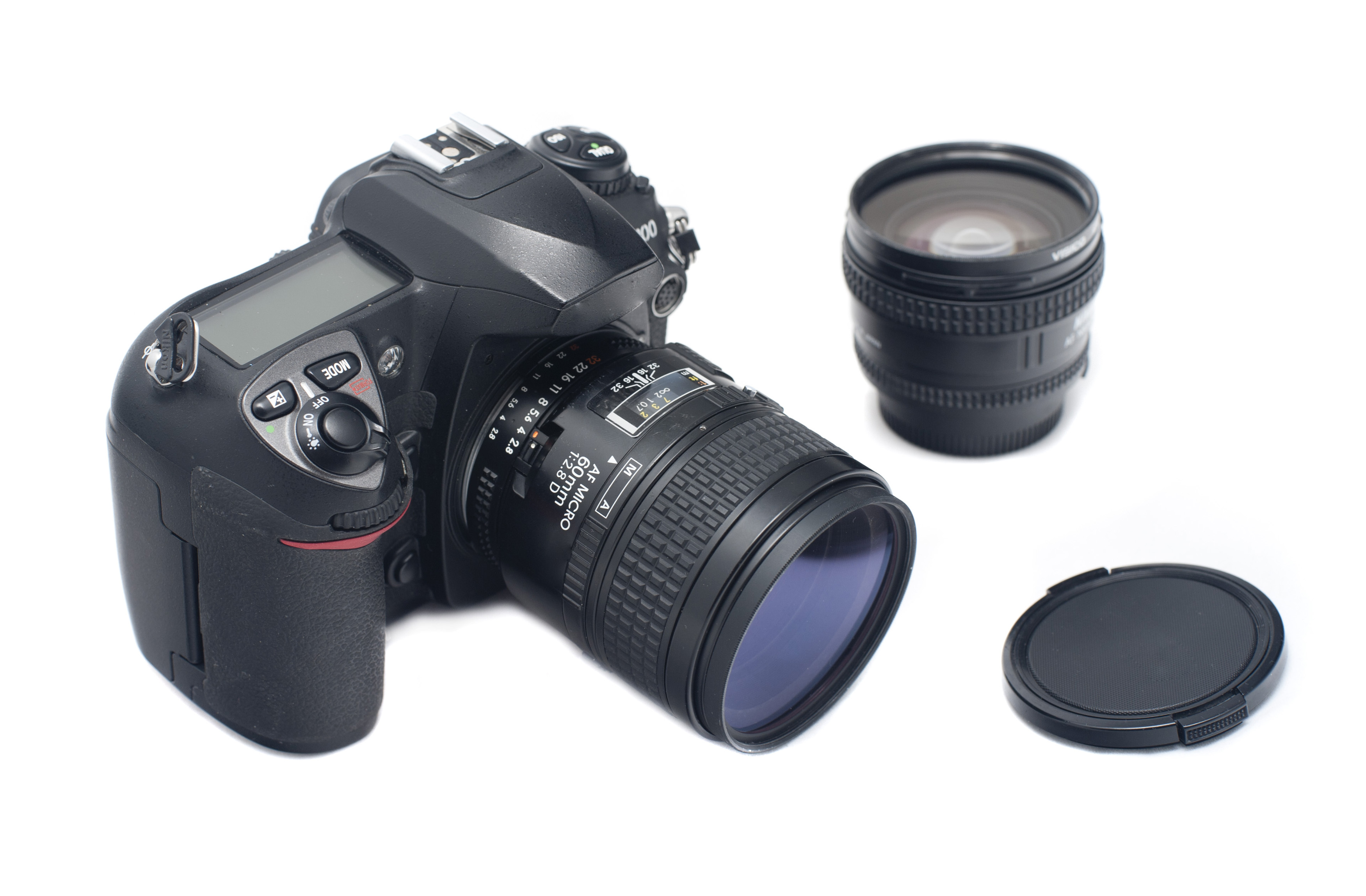 Image Description: Professional single lens reflex digital camera with detachable lens and plastic cap over white background