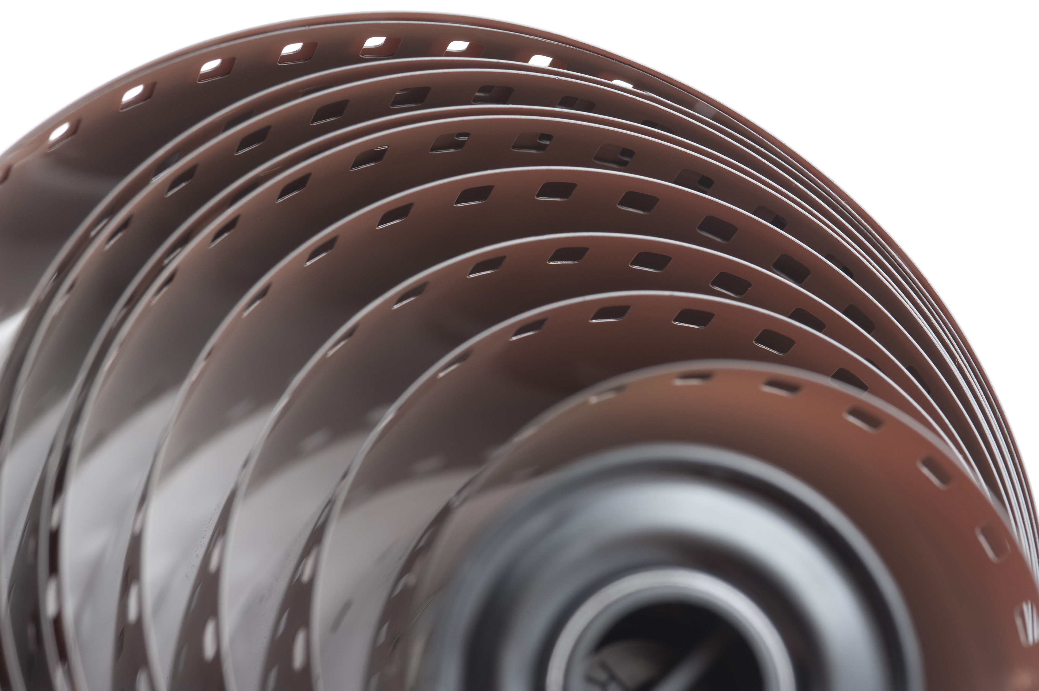 Image Description: Extreme top down close up of uncoiled roll of 35 millimetre film over white background