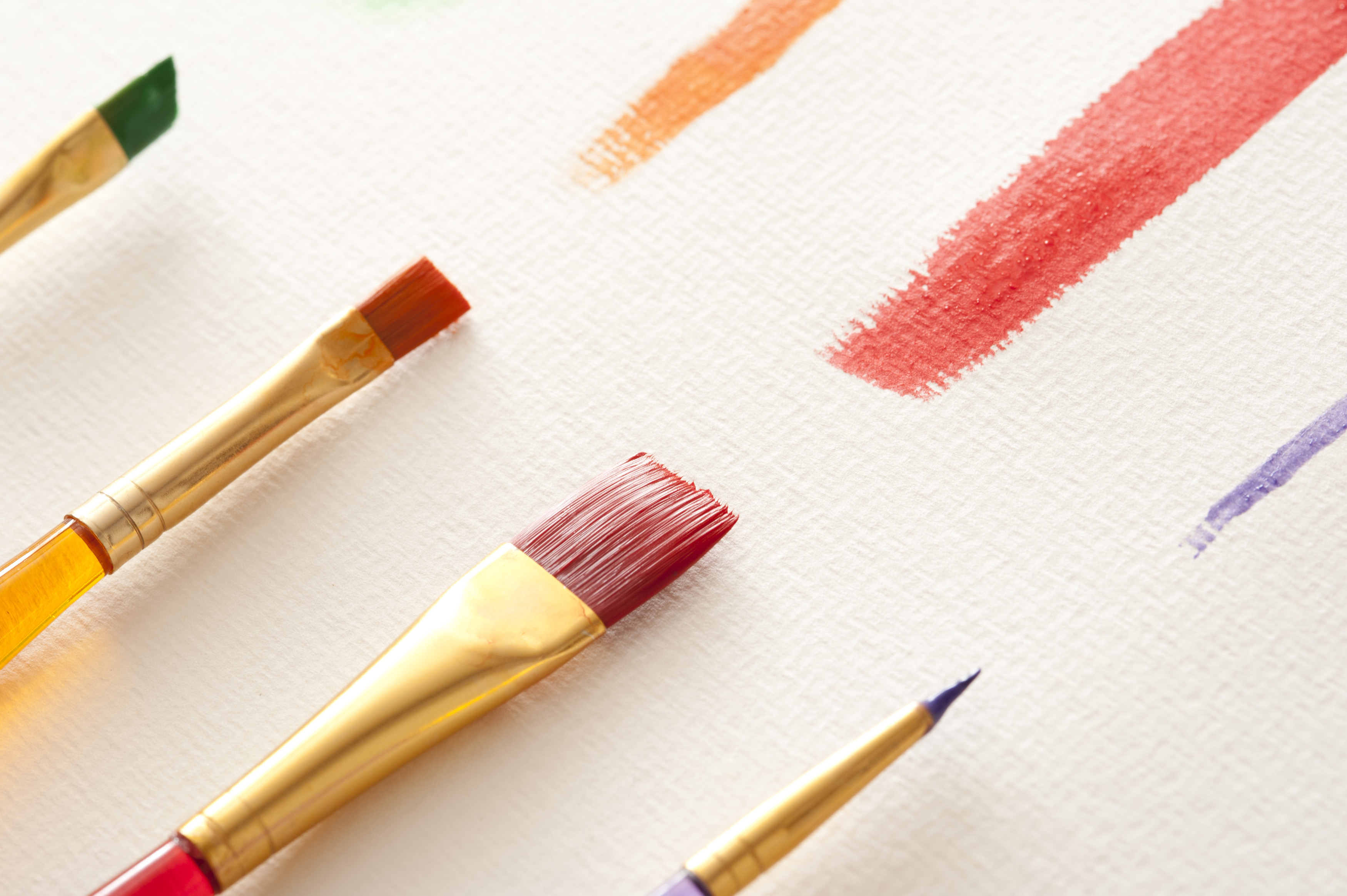 Image Description: Set of four colored paint strokes and brushes in green, orange, red and purple on white textured canvas paper
