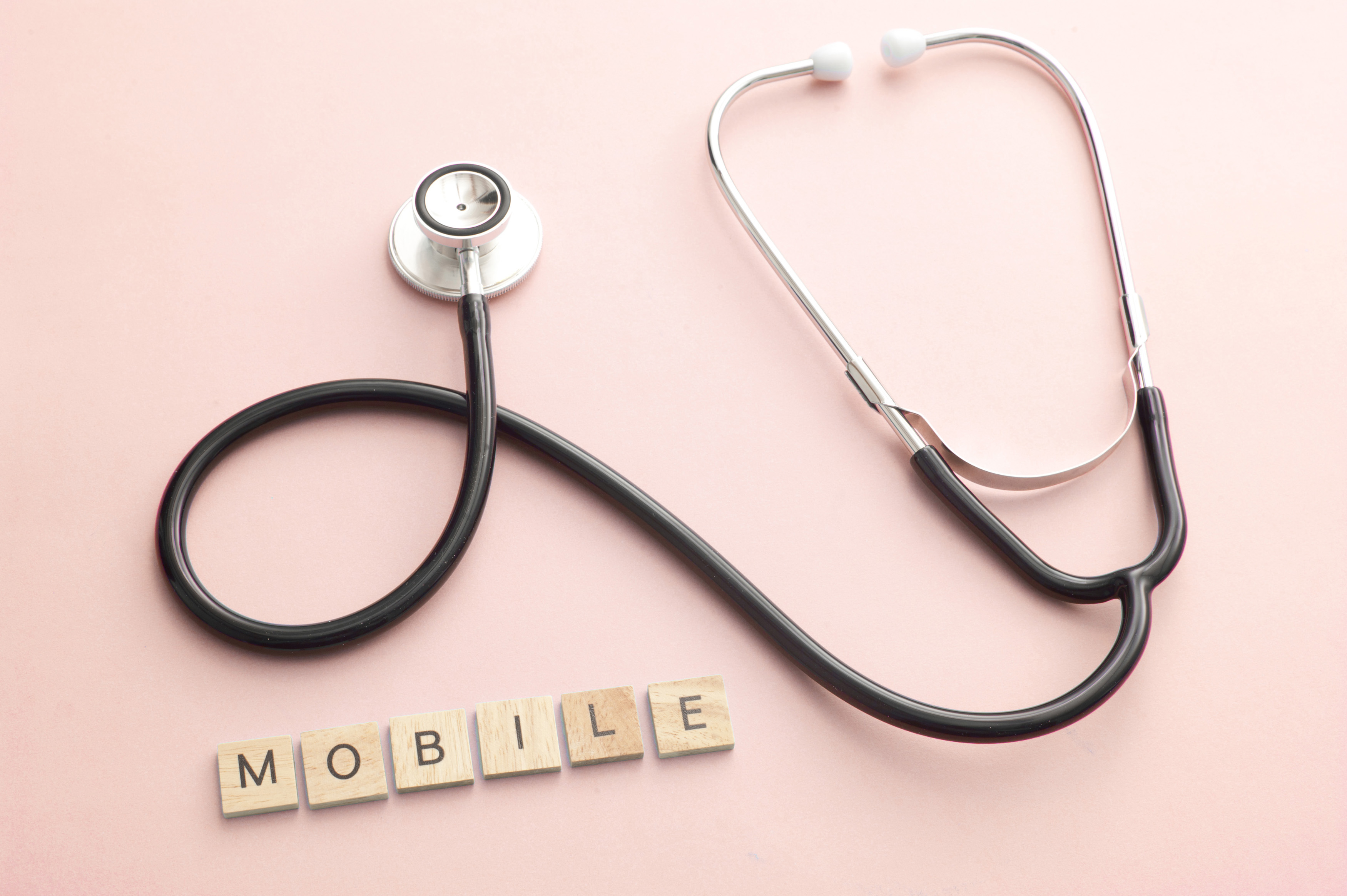 Image Description: Little blocks spelling the word mobile below professional web development concept with stetoscope over pink background