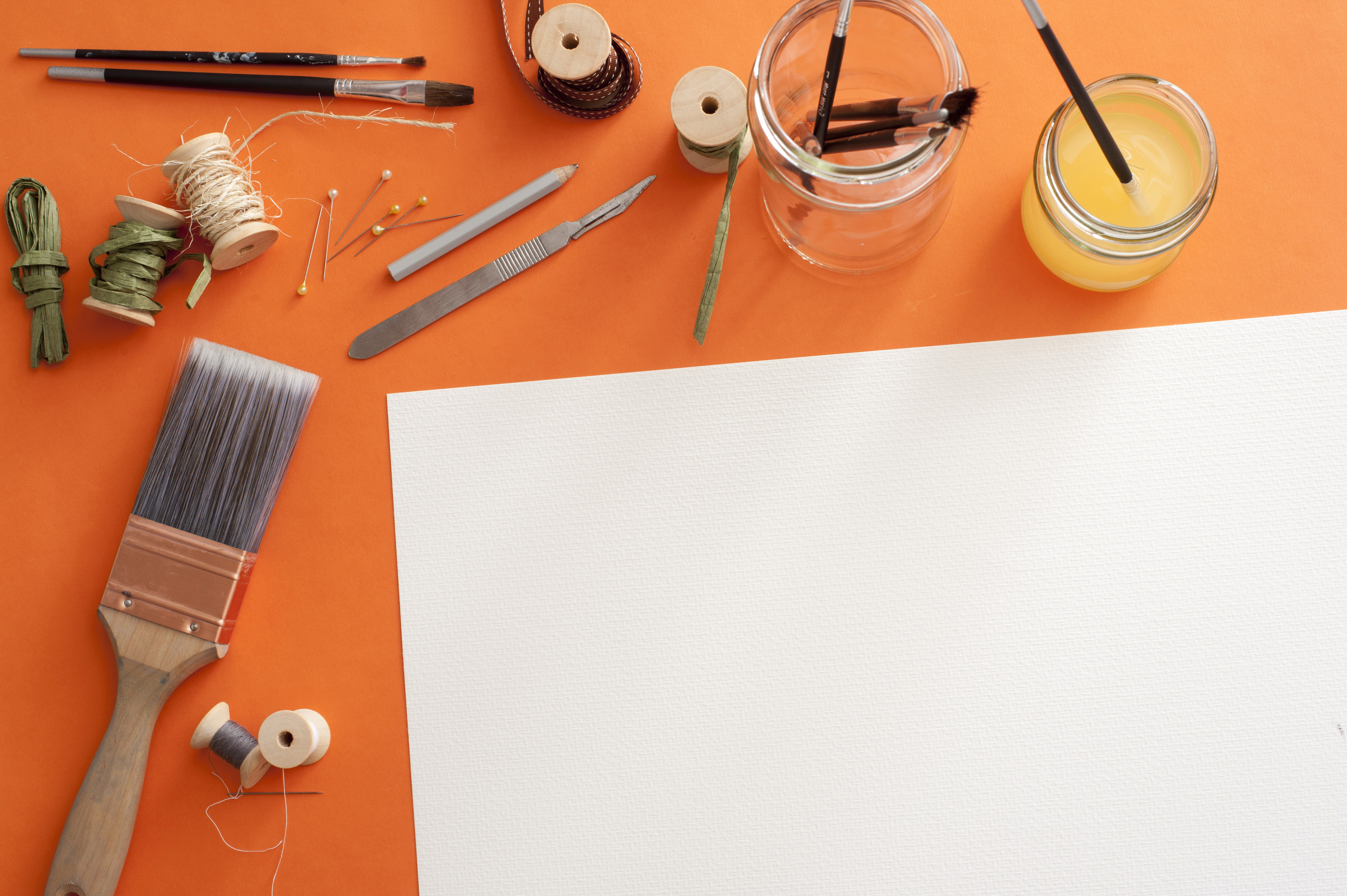Image Description: Blank paper surrounded by paint brushes, spools, thread, wire, blades and pins over orange background