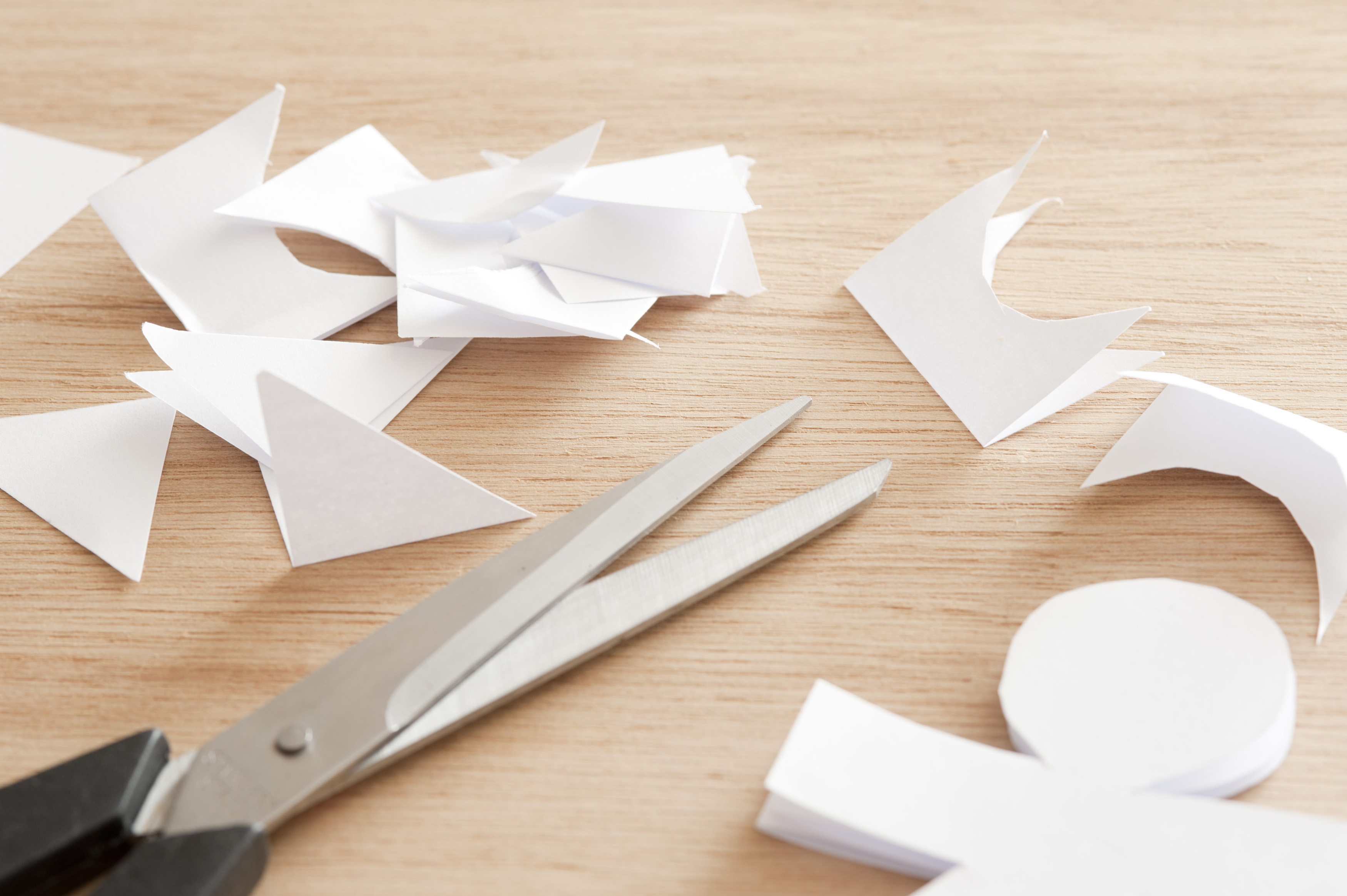 Image Description: Paper craft concept with a pair of scissors and cut out of a doll or figure lying on a wooden table