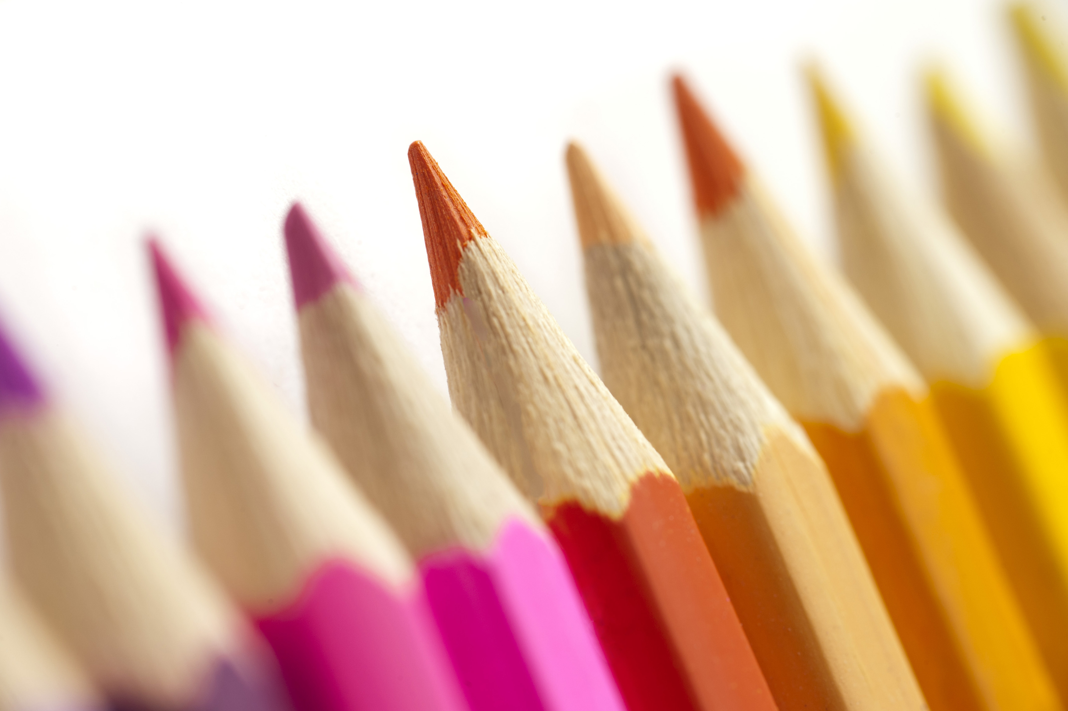 Image Description: Colorful line of wooden pencil crayons arranged magenta through red to yellow with focus to the central red crayon