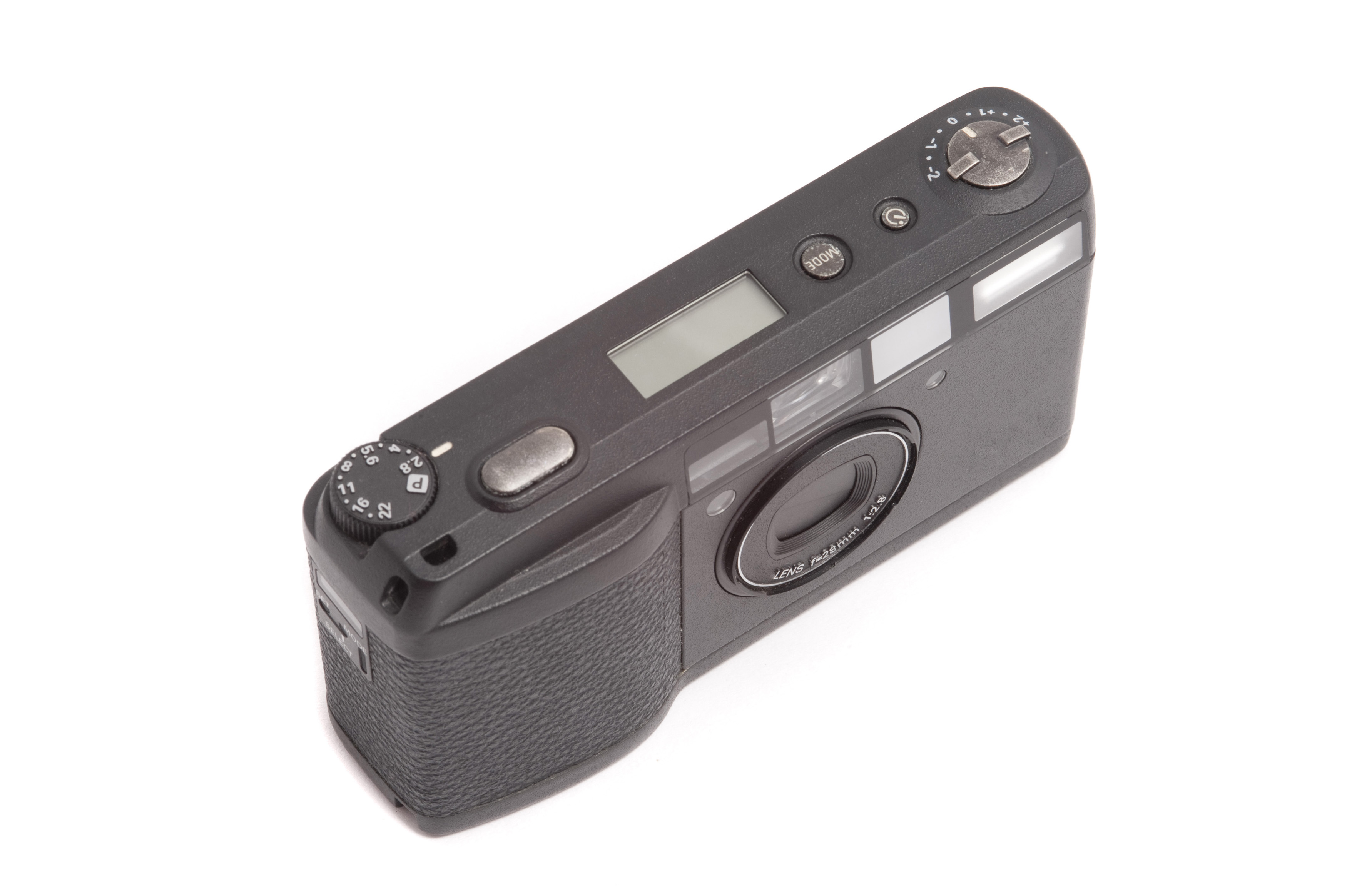 Image Description: Top down view of single isolated black compact pocket camera with retracted lens over white background