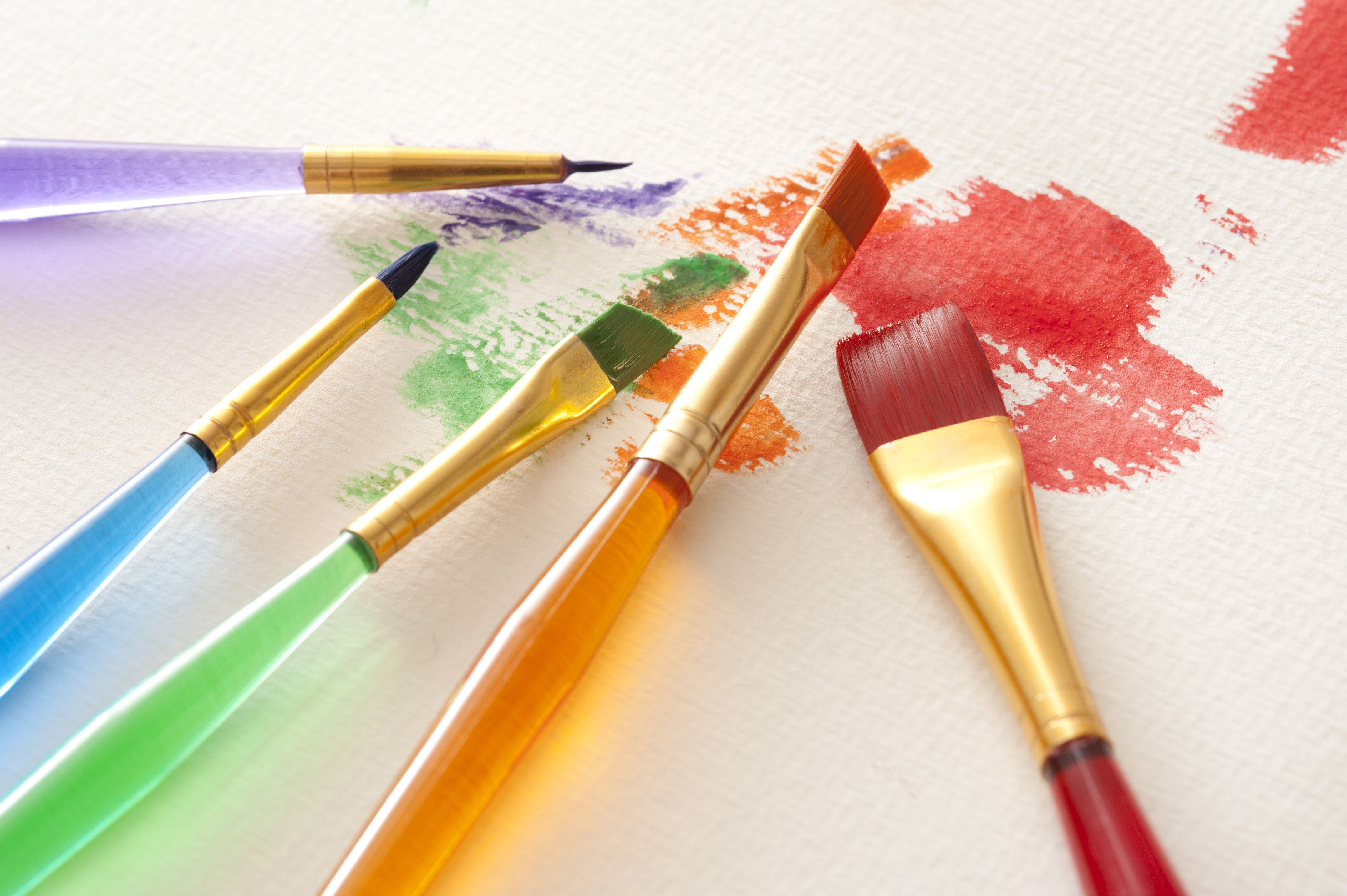 Image Description: Close up on colorful set of various watercolor brushes and primary color paint strokes scattered on white textured canvas paper