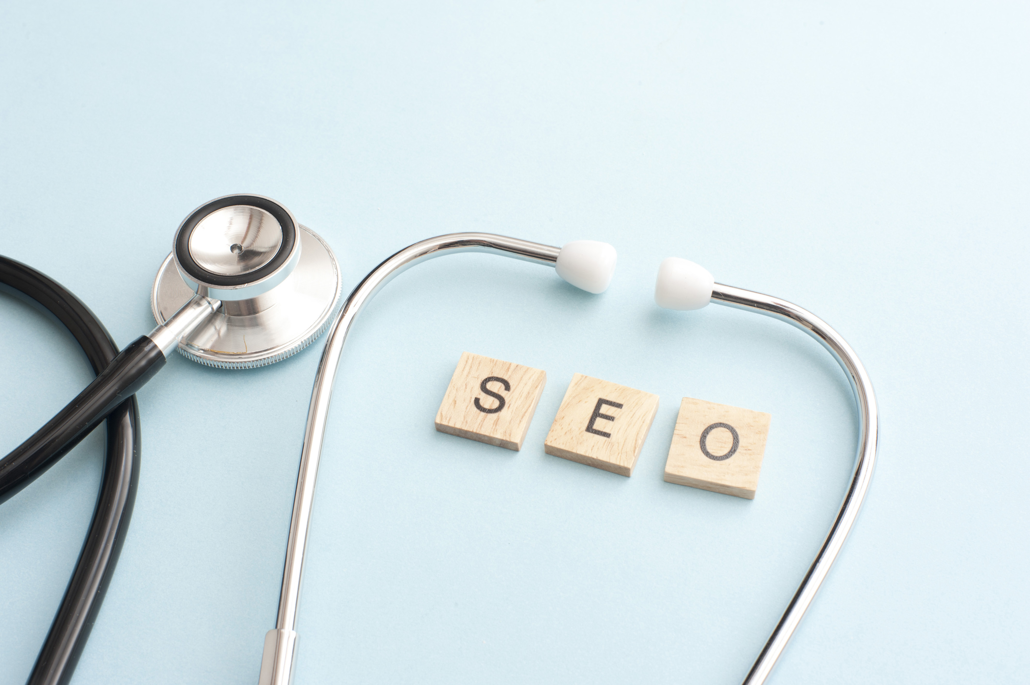 Image Description: Search engine optimization concept with doctor stethoscope surrounding letters on wooden blocks over blue background