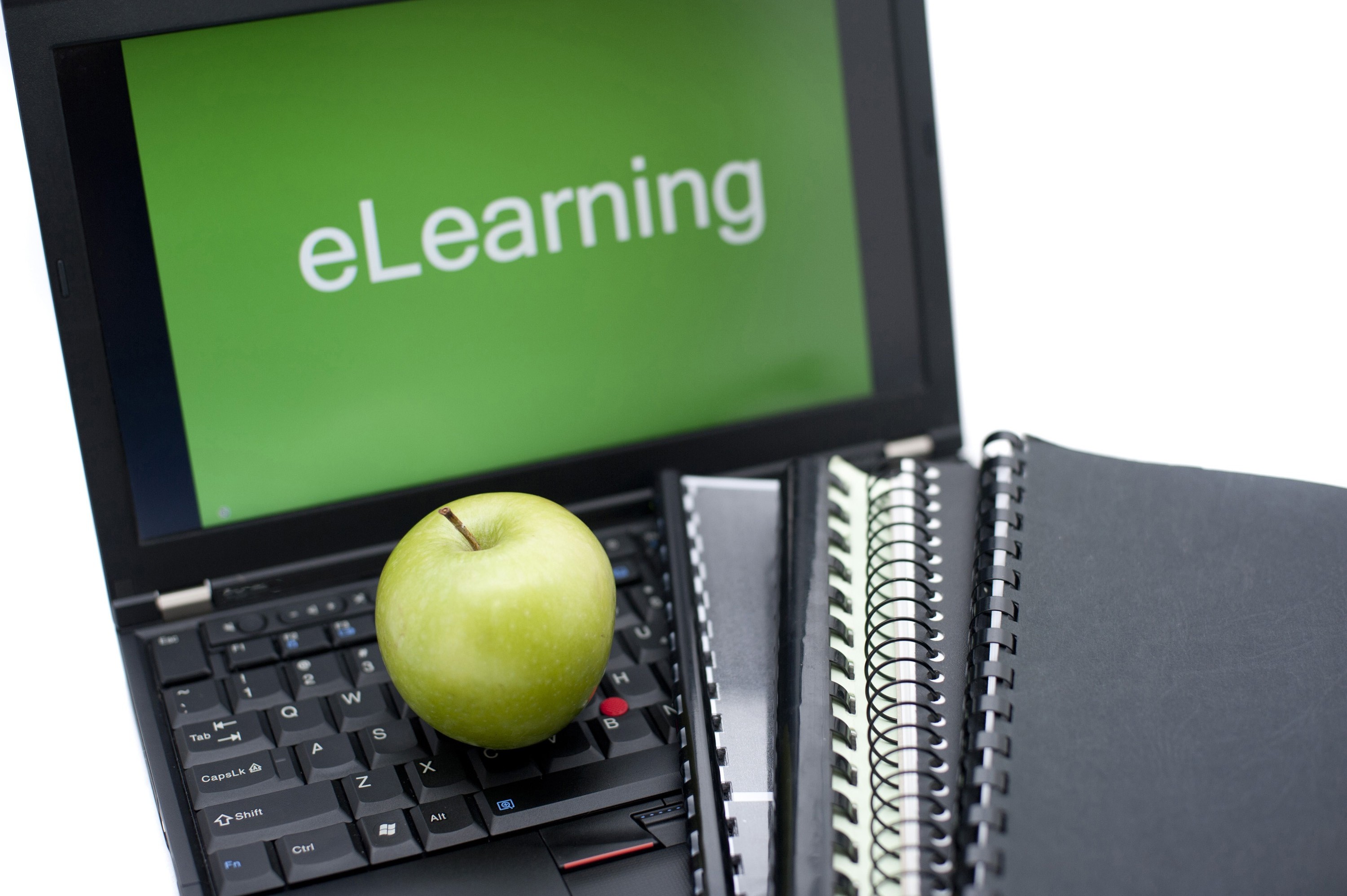 Image Description: E-learning or distance learning concept with spiral bound notebooks and a fresh green apple lying on the keyboard of an open laptop with the word eLearning visible on the screen