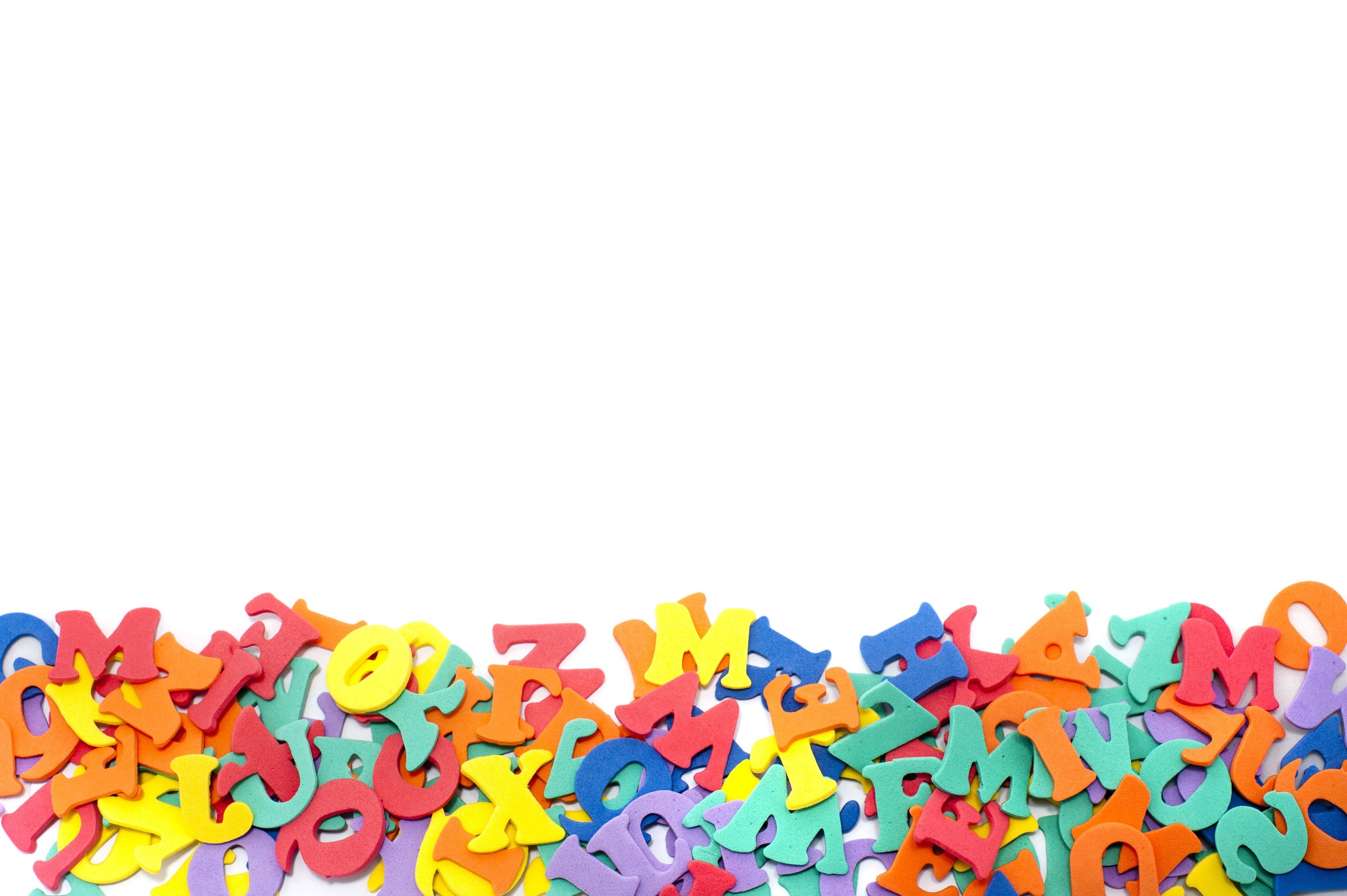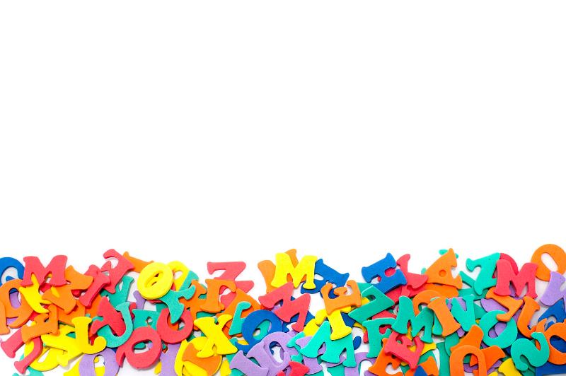 Image Description: Alphabet letter border with colourful plastic letters in a random jumble isolated against white copyspace for your education or communication concept