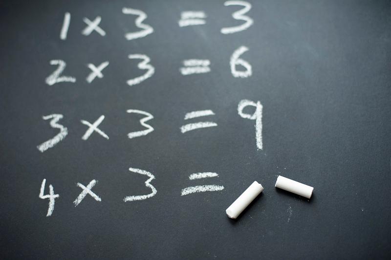 Image Description: Beginning of the three times table written in chalk on a blackboard, with a broken piece of chalk against the last, unanswered sum