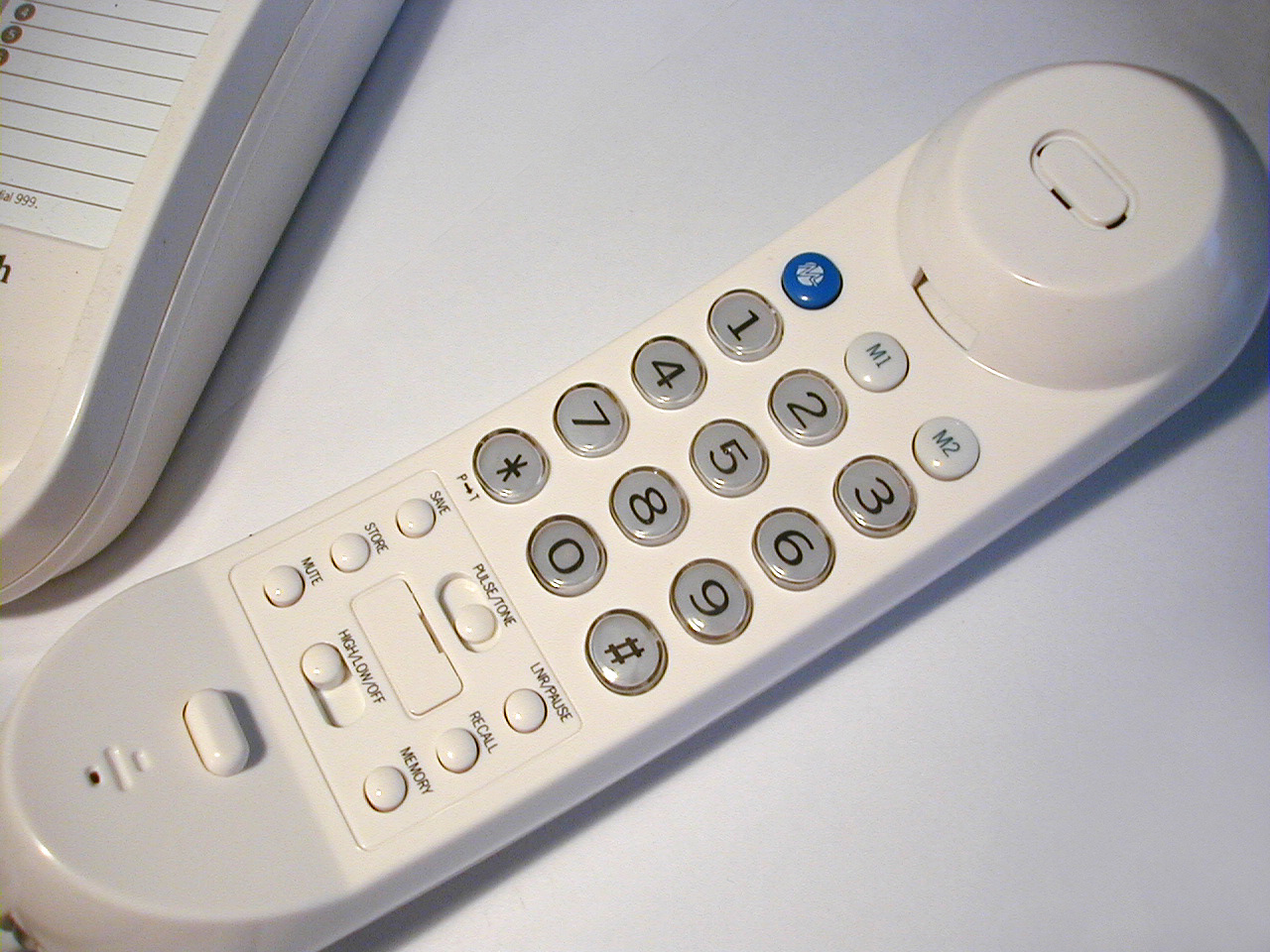 Image Description: White handset of a land line telephone off the hook lying on a white surface with the keypad uppermost