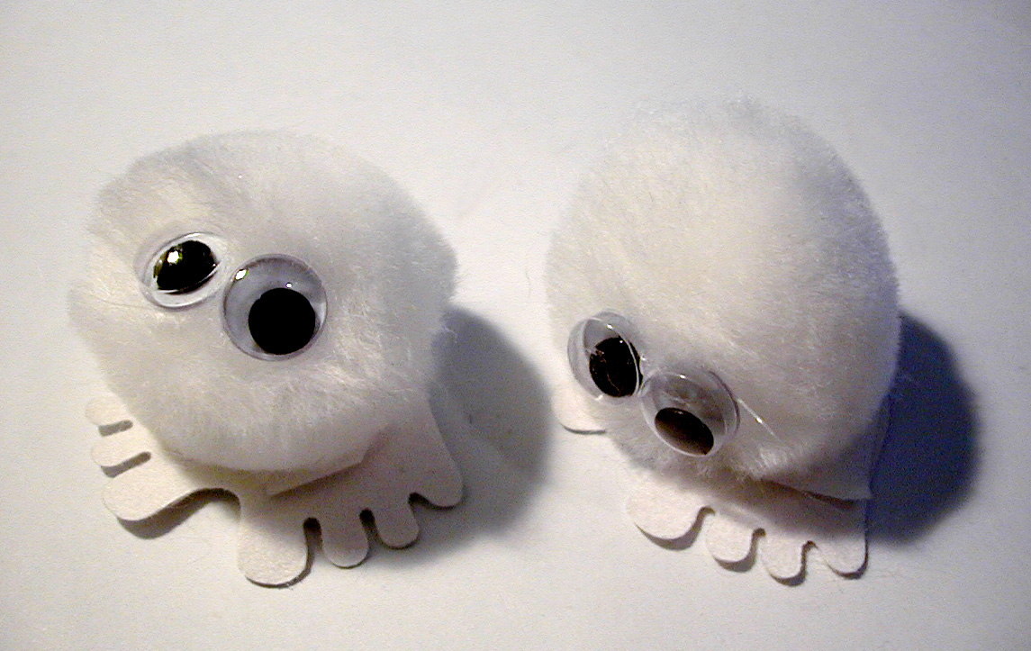 Image Description: Overhead view of cute fluffy white puff balls with felt feet and glued on eyes