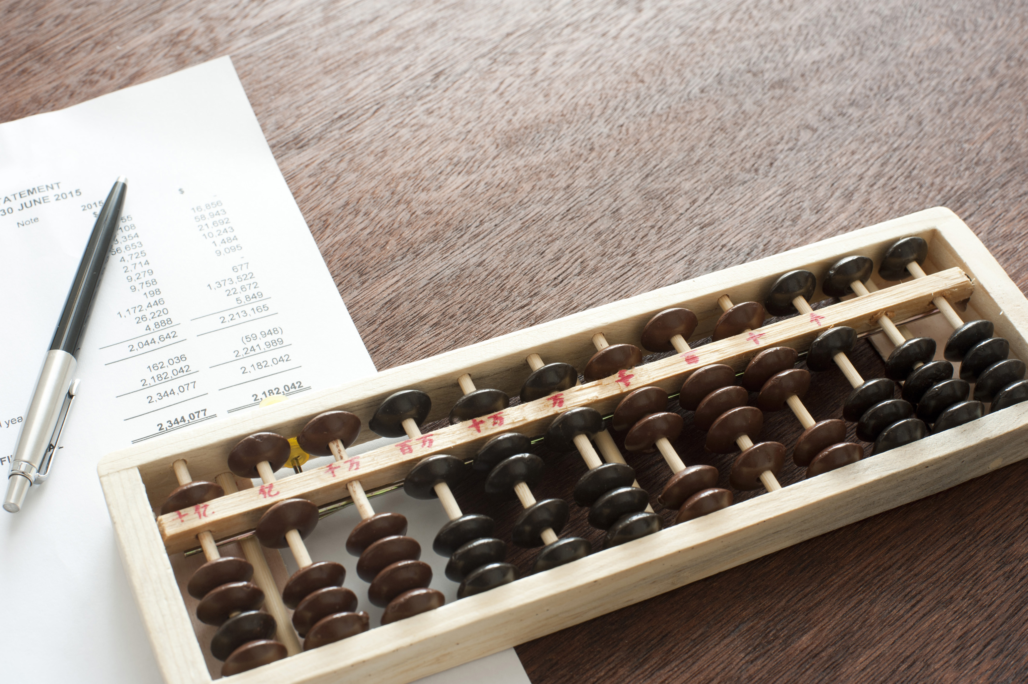 Image Description: Wooden abacus being used for accounting lying on a desk with a balance sheet and ballpoint pen viewed from above