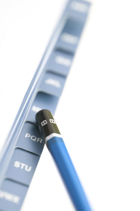 Image Description: Using the end of a pencil to search an index of alphabetical tabs on an address book