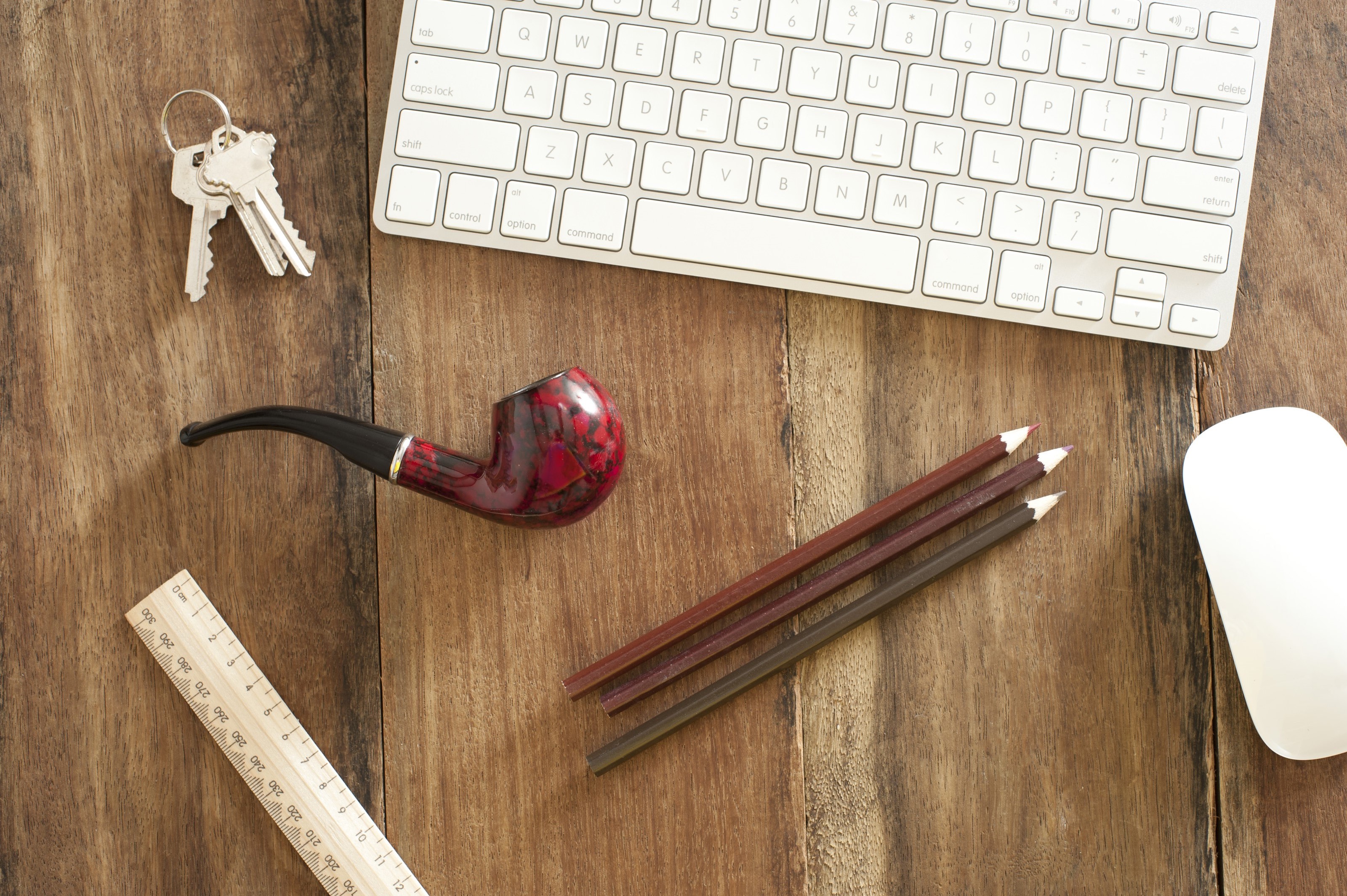 Image Description: a still life of various desk objects, a computer mouse and keyboards, pencils, keys and a tobacco pipe