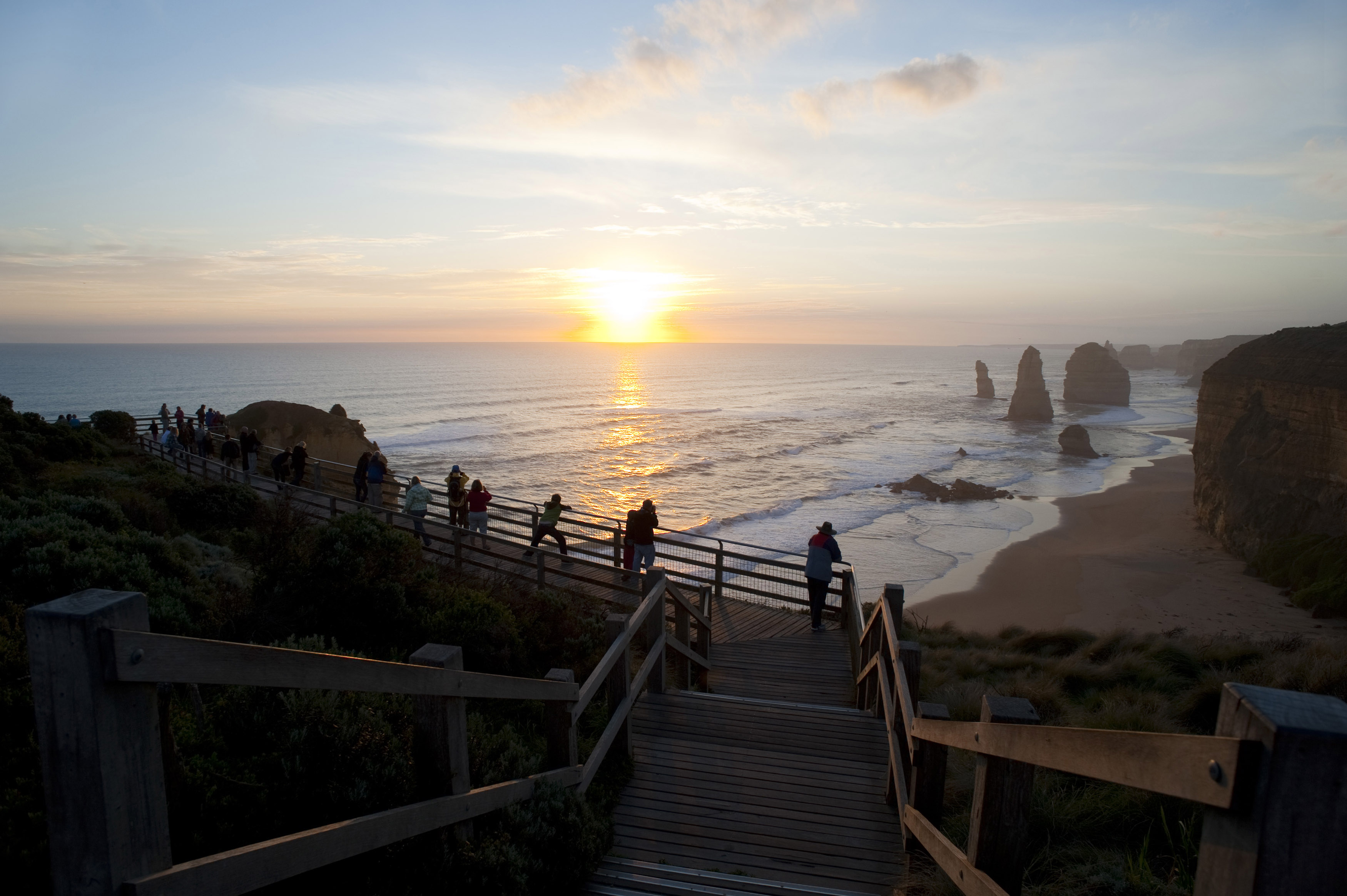 Image Description: People watching sunset at viewpoint by Twelve Apostles limestone rock formation, Great Ocean Road, Victoria, Australia