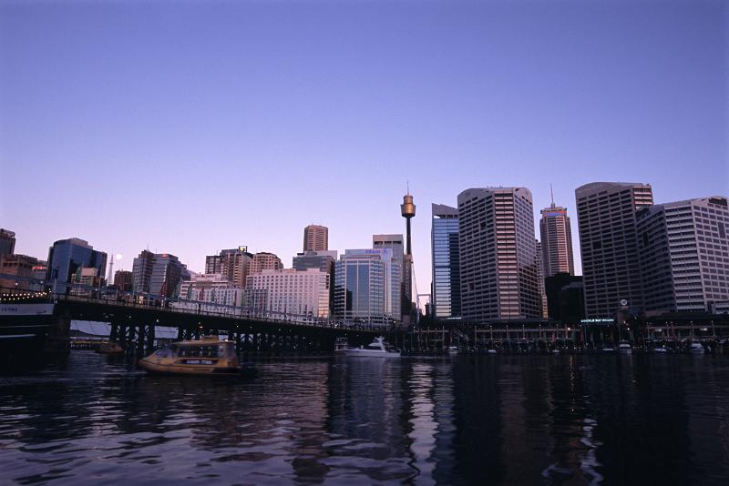 Image Description: Darling harbour, Sydney, Australia with the Prymont Bridge and buildings of the CBD in the background