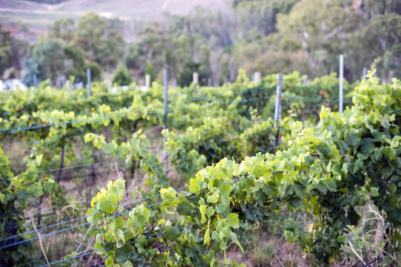Image Description: Rows of grape green vines at a vineyard in the rolling Adelaide hills and Barossa valley.