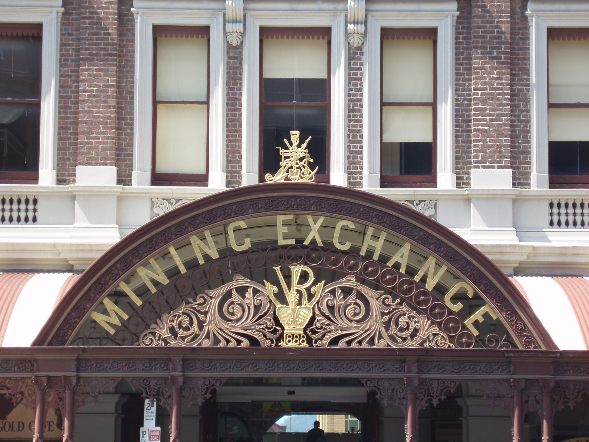 Image Description: Exterior of the Ballarat Mining Exchange, Victoria dating from the time of the Gold Rush in Australia with its ornate semi-circular sign
