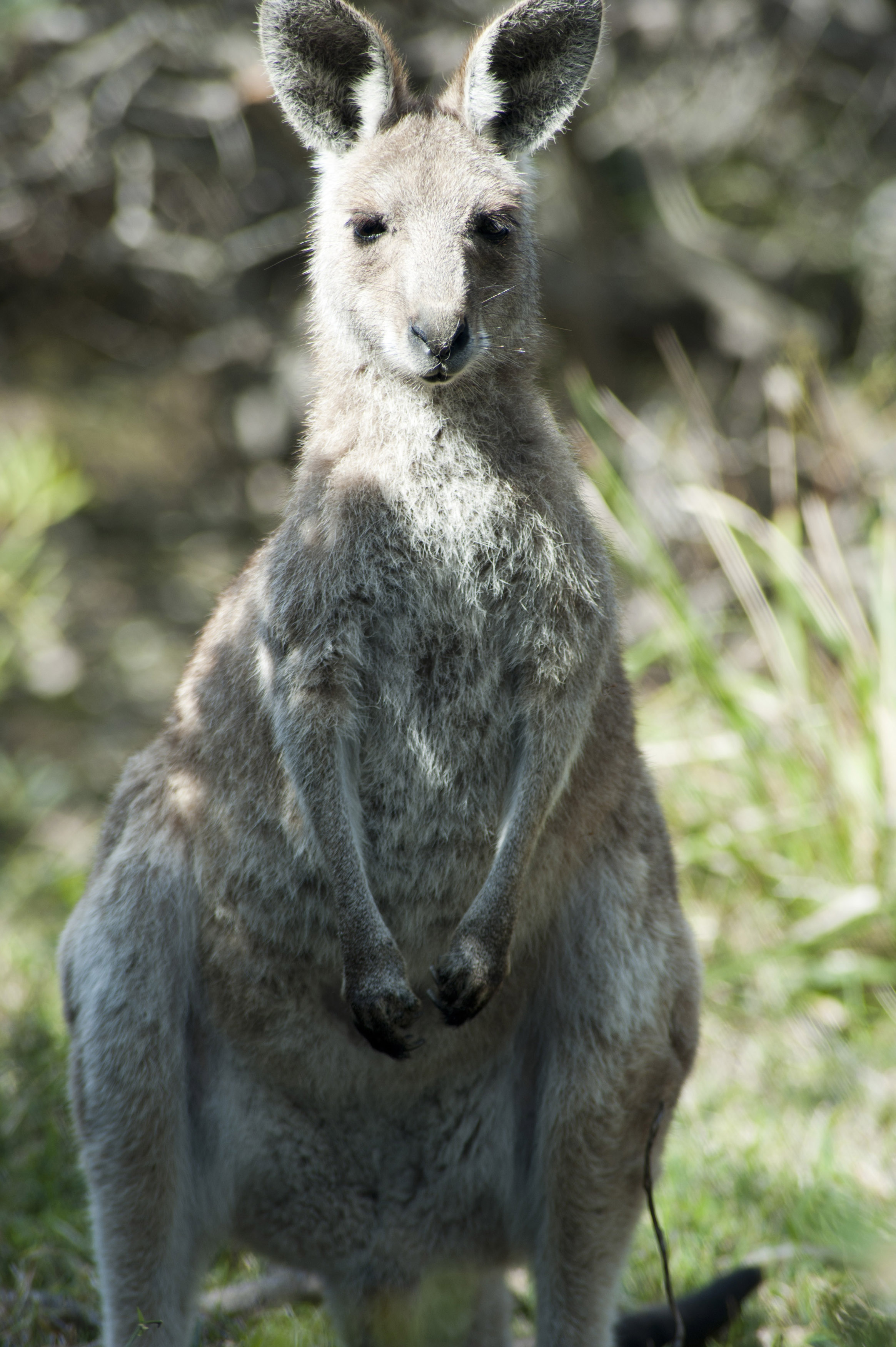 Image Description: A portrait of a cute wild grey kangaroo with ears standing and facing towards the camera.